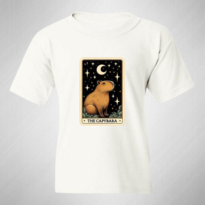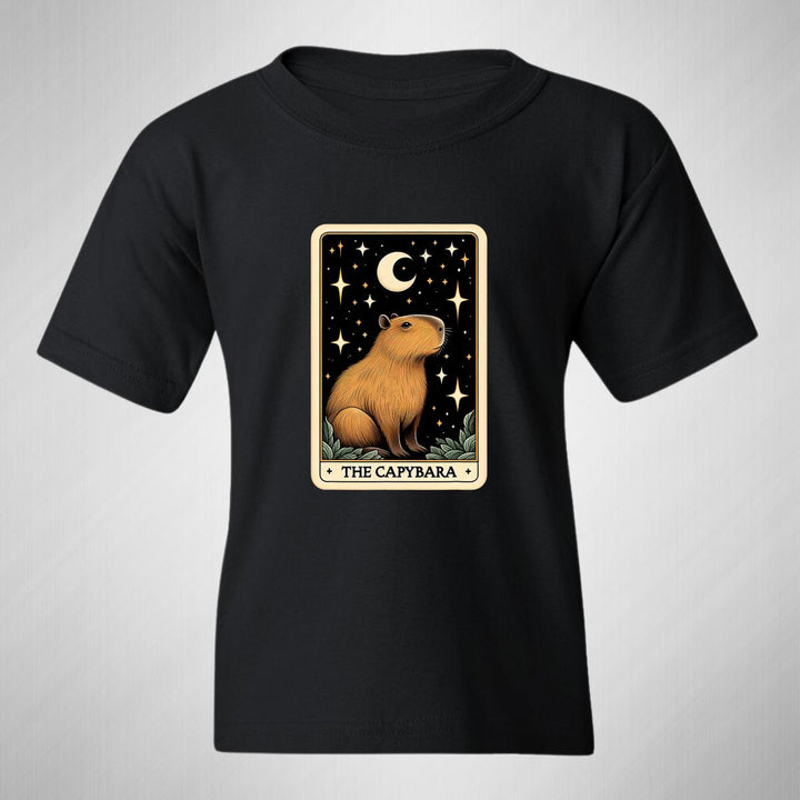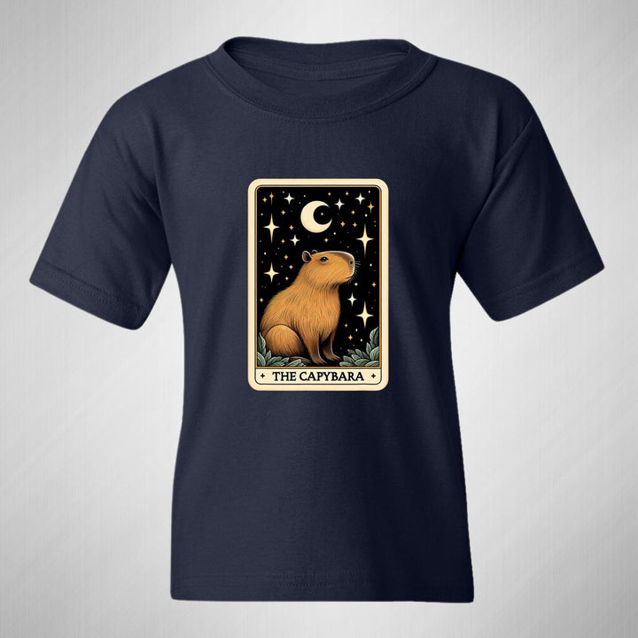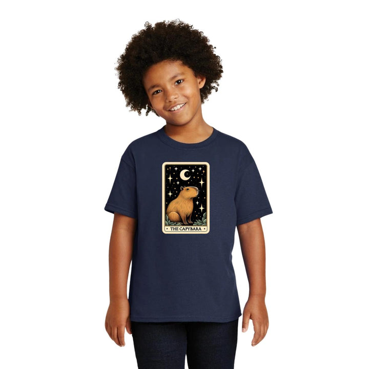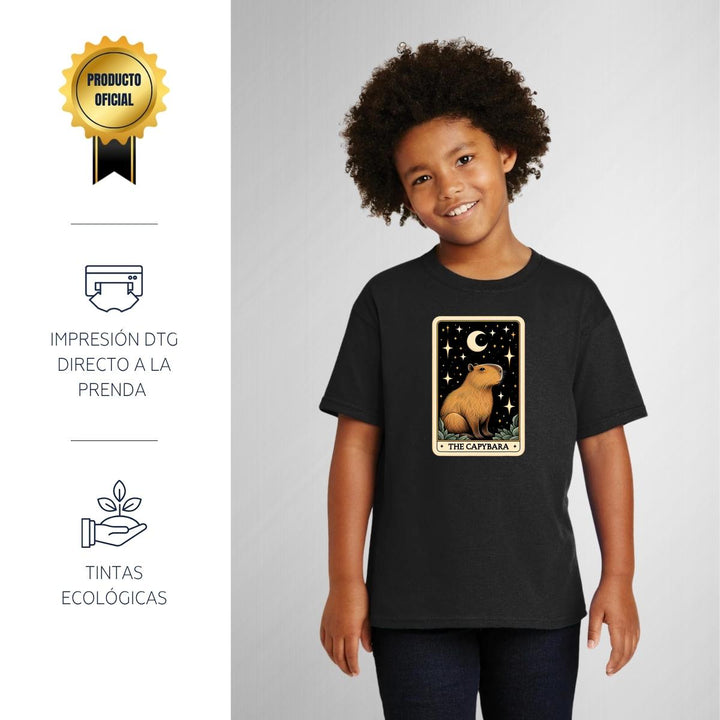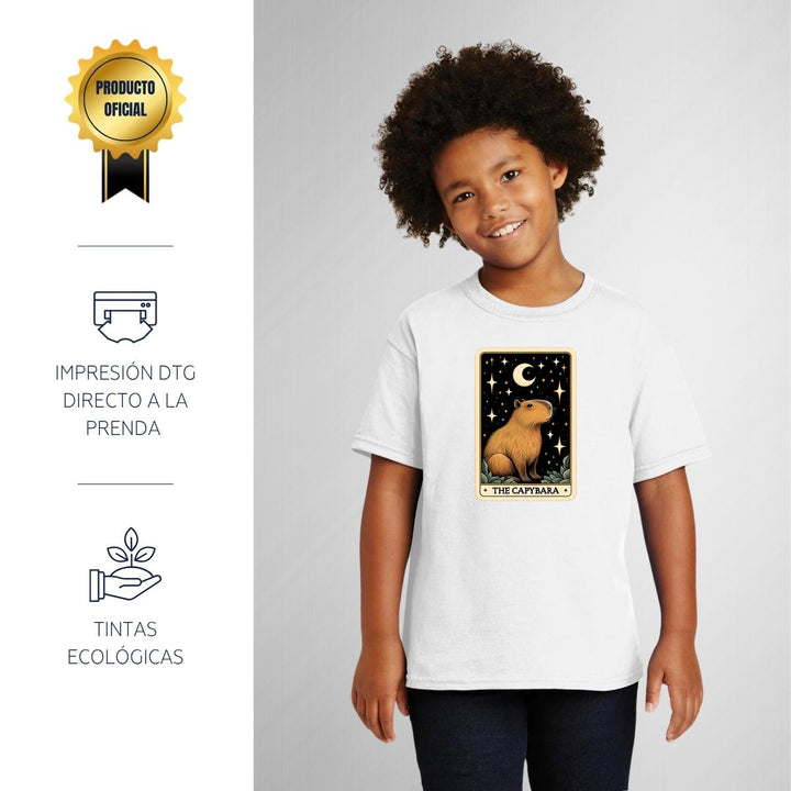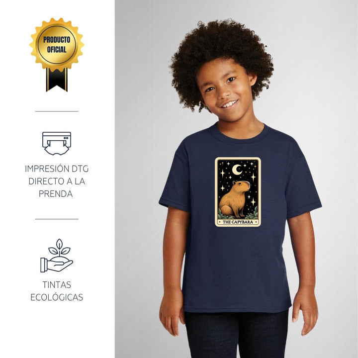 Playera infantil manga corta, cuello redondo para niño o niña nueva, diseño Capibara Carpincho Frases original impreso con tecnología DTG (directo a la prenda) tacto cero, uso casual o deportiva, 100% algodón chifón pre encogido, estructura tubular sin costuras laterales. Colores de camiseta: Negro, Blanco, Azul Marino.