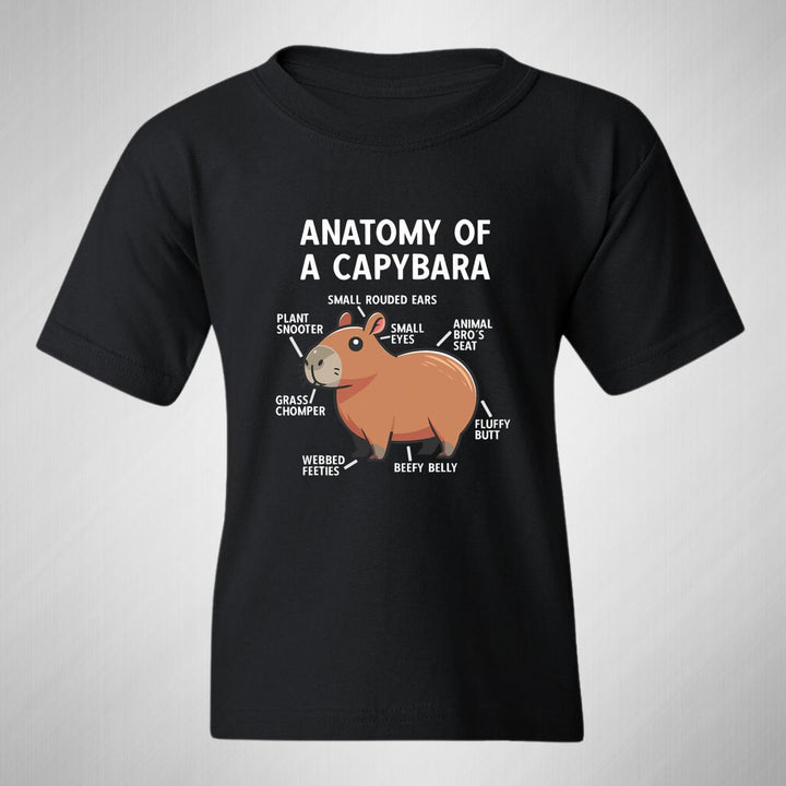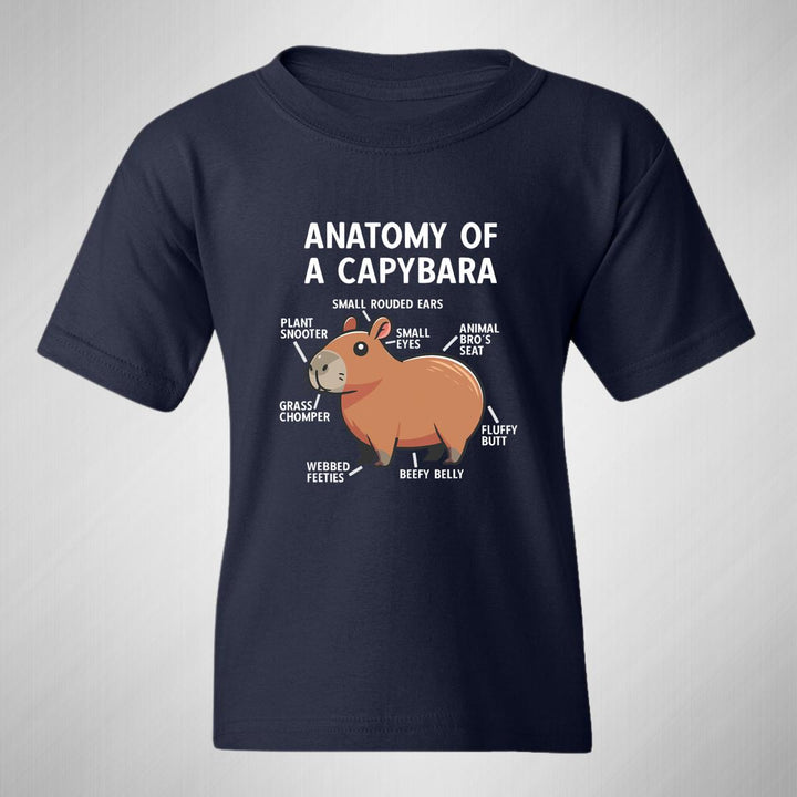 Playera infantil manga corta, cuello redondo para niño o niña nueva, diseño Capibara Carpincho Frases original impreso con tecnología DTG (directo a la prenda) tacto cero, uso casual o deportiva, 100% algodón chifón pre encogido, estructura tubular sin costuras laterales. Colores de camiseta: Negro, Azul Marino.