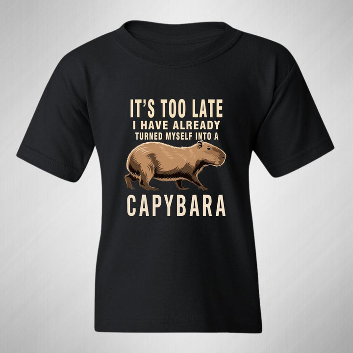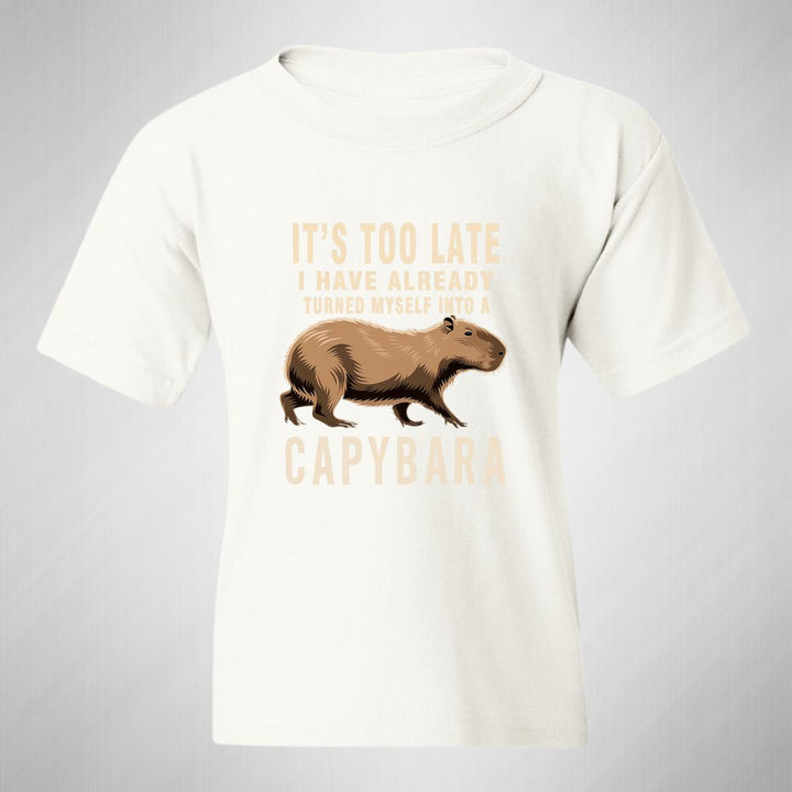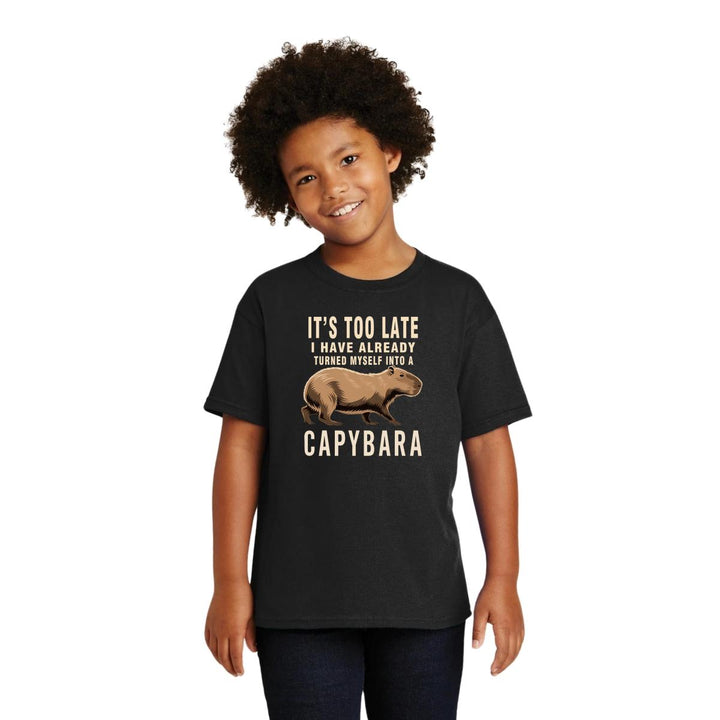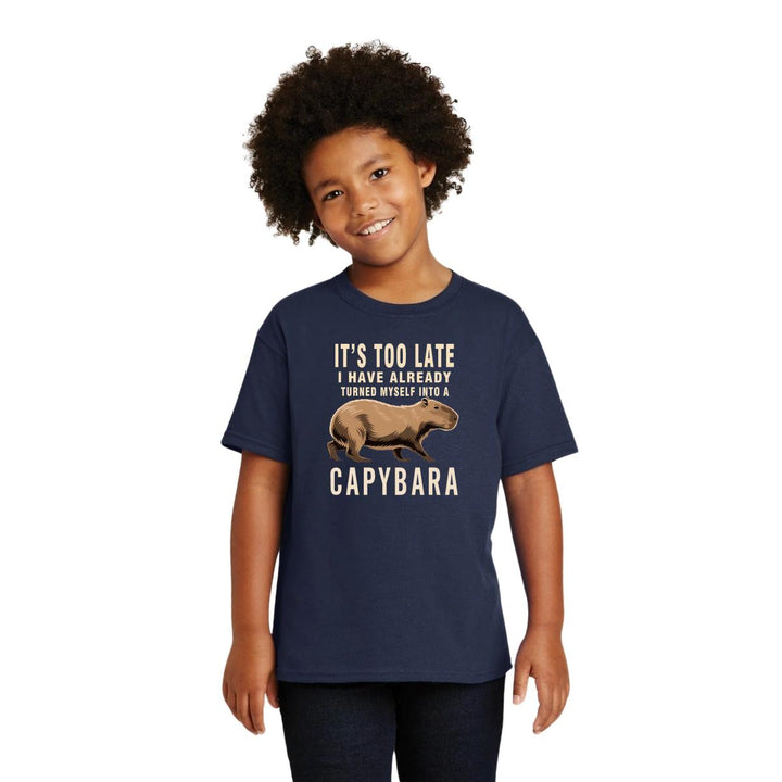 Playera infantil manga corta, cuello redondo para niño o niña nueva, diseño Capibara Carpincho Frases original impreso con tecnología DTG (directo a la prenda) tacto cero, uso casual o deportiva, 100% algodón chifón pre encogido, estructura tubular sin costuras laterales. Colores de camiseta: Negro, Blanco, Azul Marino.