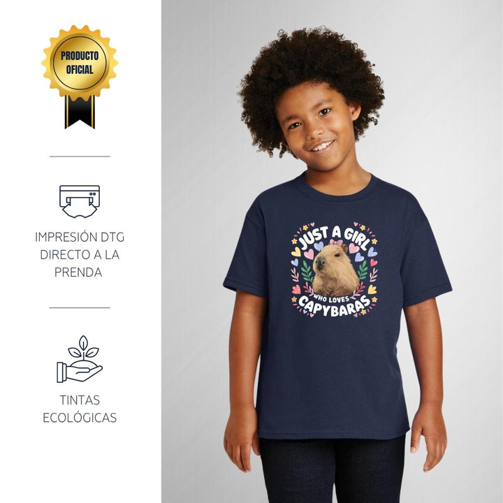 Playera infantil manga corta, cuello redondo para niño o niña nueva, diseño Capibara Carpincho Frases original impreso con tecnología DTG (directo a la prenda) tacto cero, uso casual o deportiva, 100% algodón chifón pre encogido, estructura tubular sin costuras laterales. Colores de camiseta: Negro, Azul Marino.