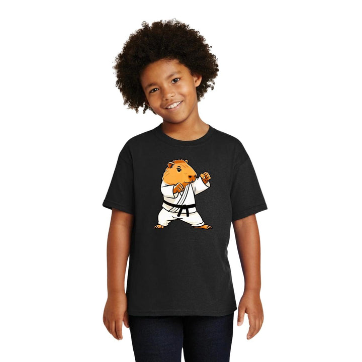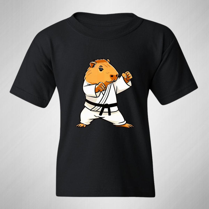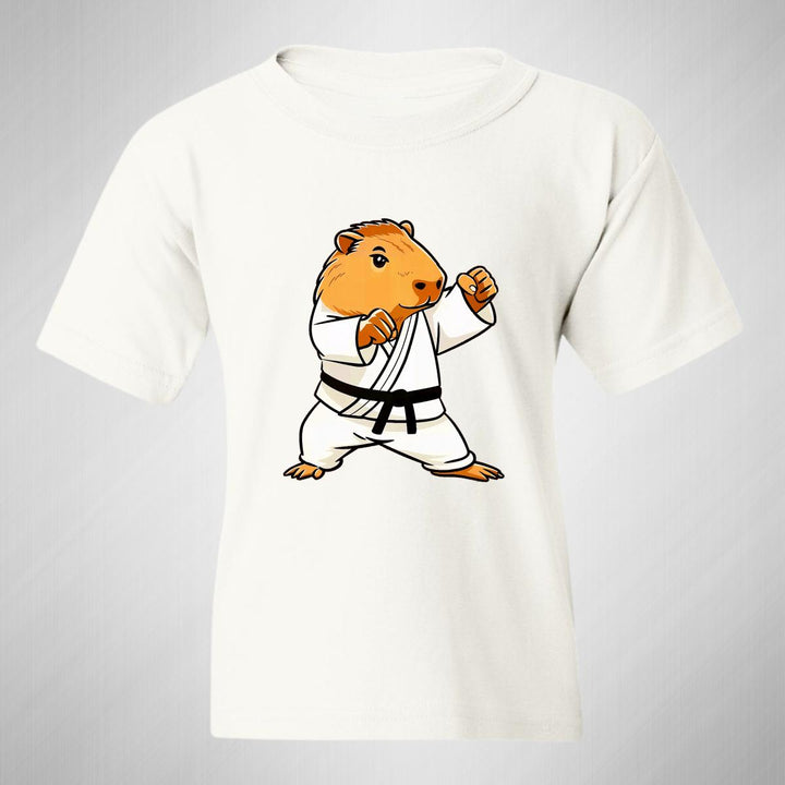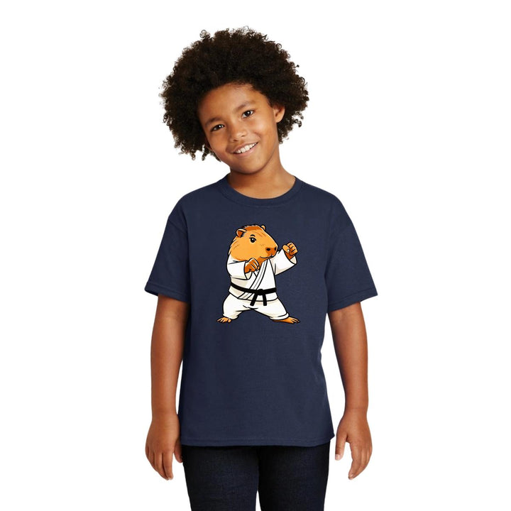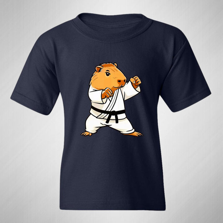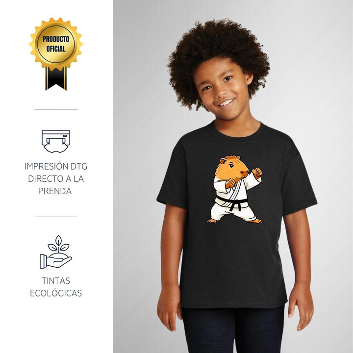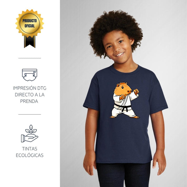 Playera infantil manga corta, cuello redondo para niño o niña nueva, diseño Capibara Carpincho Frases original impreso con tecnología DTG (directo a la prenda) tacto cero, uso casual o deportiva, 100% algodón chifón pre encogido, estructura tubular sin costuras laterales. Colores de camiseta: Negro, Blanco, Azul Marino.