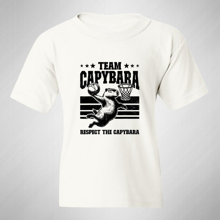 Playera infantil manga corta, cuello redondo para niño o niña nueva, diseño Capibara Carpincho Frases original impreso con tecnología DTG (directo a la prenda) tacto cero, uso casual o deportiva, 100% algodón chifón pre encogido, estructura tubular sin costuras laterales. Colores de camiseta: Blanco.