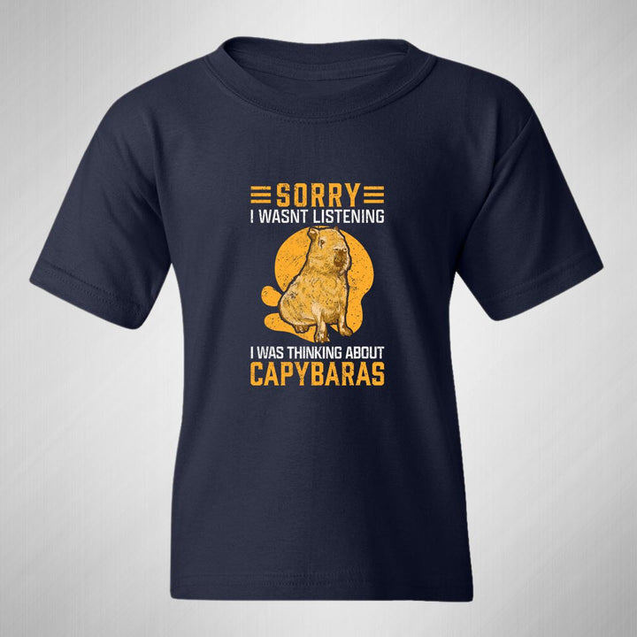 Playera infantil manga corta, cuello redondo para niño o niña nueva, diseño Capibara Carpincho Frases original impreso con tecnología DTG (directo a la prenda) tacto cero, uso casual o deportiva, 100% algodón chifón pre encogido, estructura tubular sin costuras laterales. Colores de camiseta: Negro, Azul Marino.