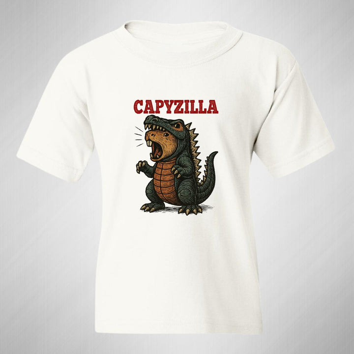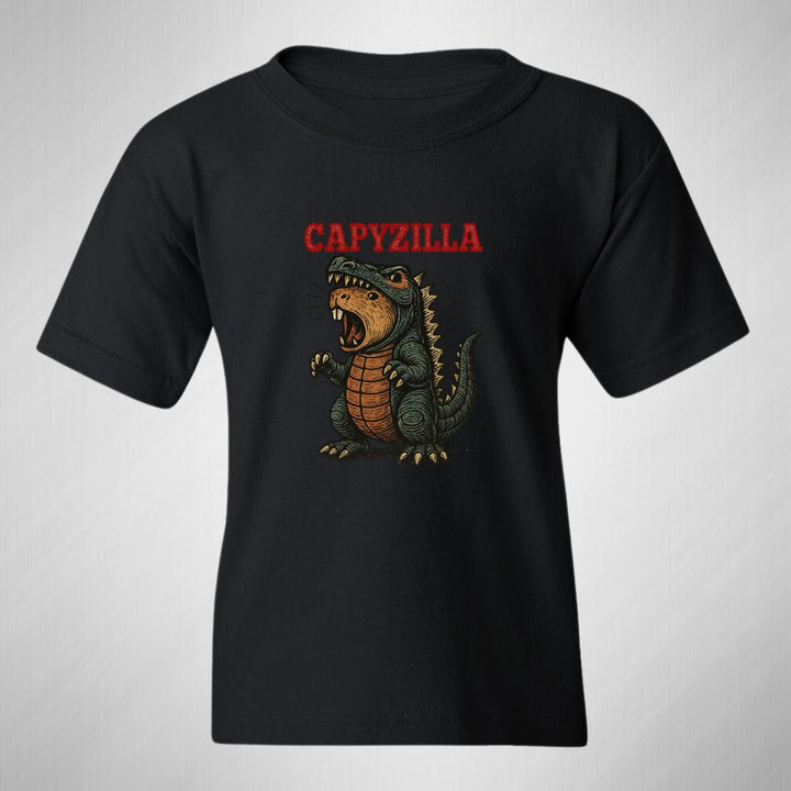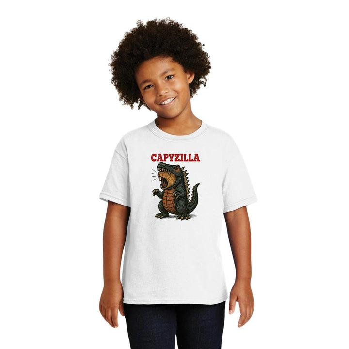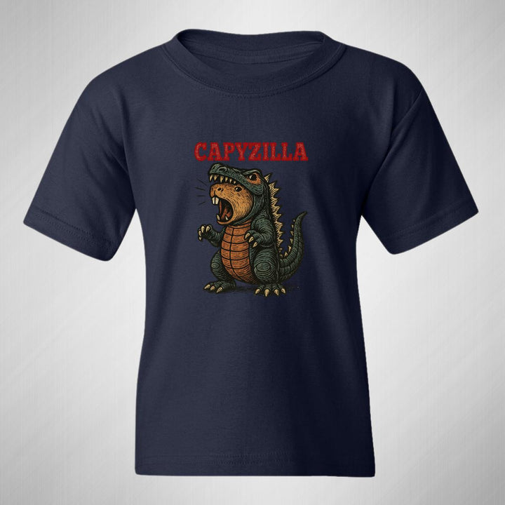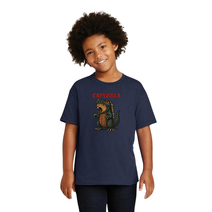 Playera infantil manga corta, cuello redondo para niño o niña nueva, diseño Capibara Carpincho Frases original impreso con tecnología DTG (directo a la prenda) tacto cero, uso casual o deportiva, 100% algodón chifón pre encogido, estructura tubular sin costuras laterales. Colores de camiseta: Negro, Blanco, Azul Marino.