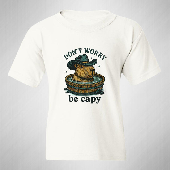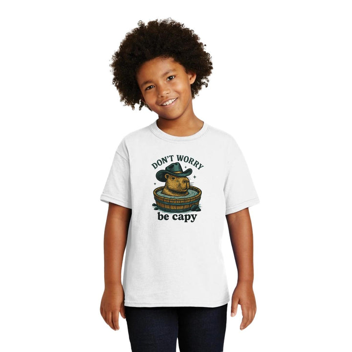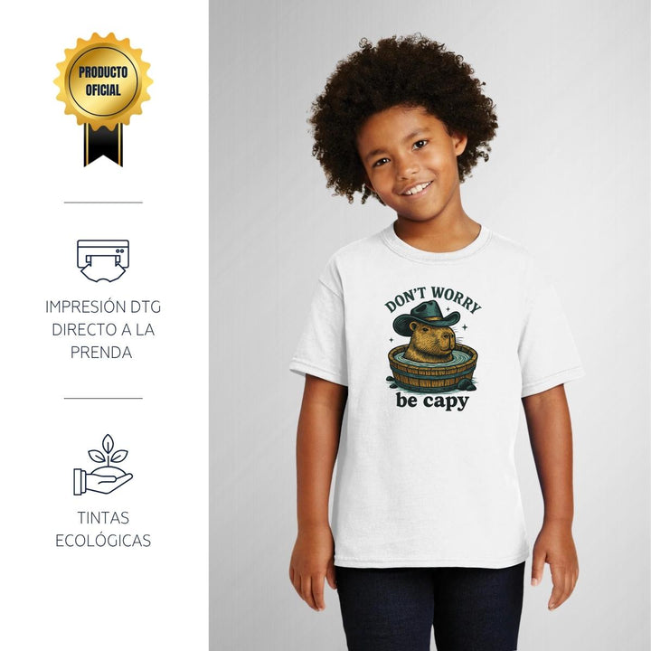 Playera infantil manga corta, cuello redondo para niño o niña nueva, diseño Capibara Carpincho Frases original impreso con tecnología DTG (directo a la prenda) tacto cero, uso casual o deportiva, 100% algodón chifón pre encogido, estructura tubular sin costuras laterales. Colores de camiseta: Blanco.