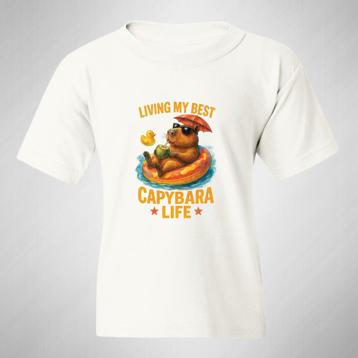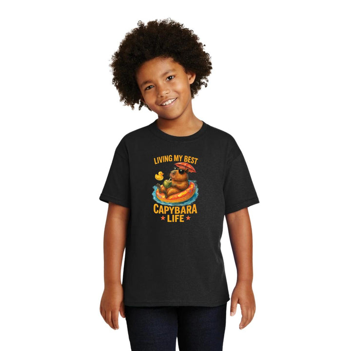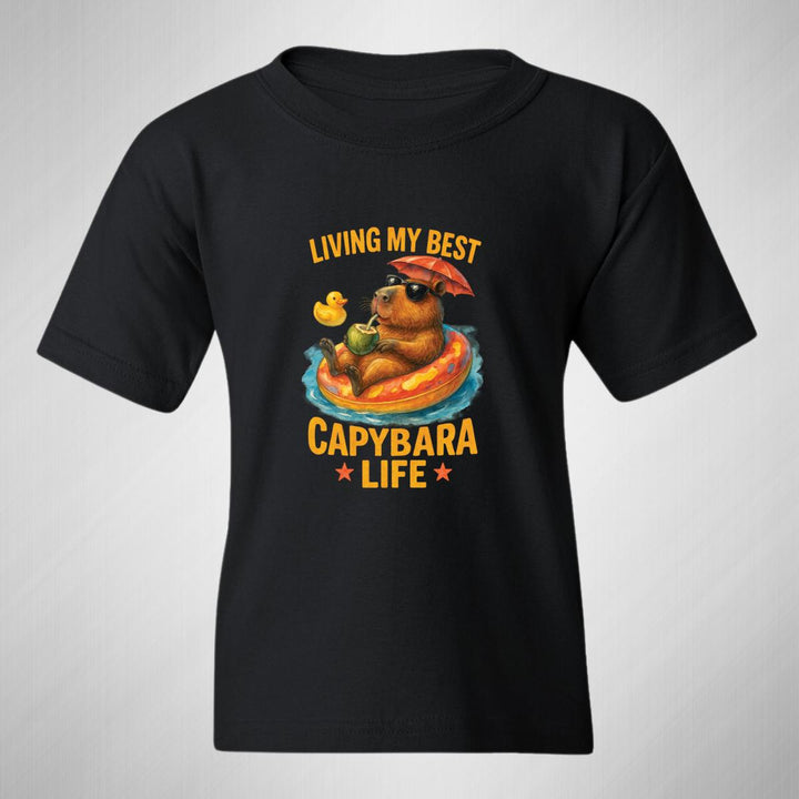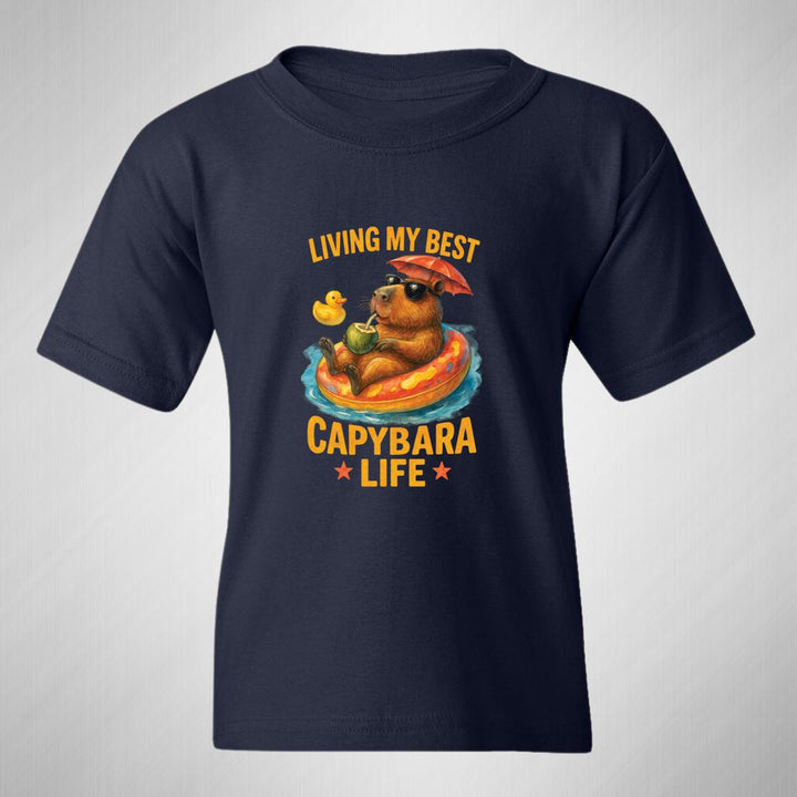 Playera infantil manga corta, cuello redondo para niño o niña nueva, diseño Capibara Carpincho Frases original impreso con tecnología DTG (directo a la prenda) tacto cero, uso casual o deportiva, 100% algodón chifón pre encogido, estructura tubular sin costuras laterales. Colores de camiseta: Negro, Blanco, Azul Marino.