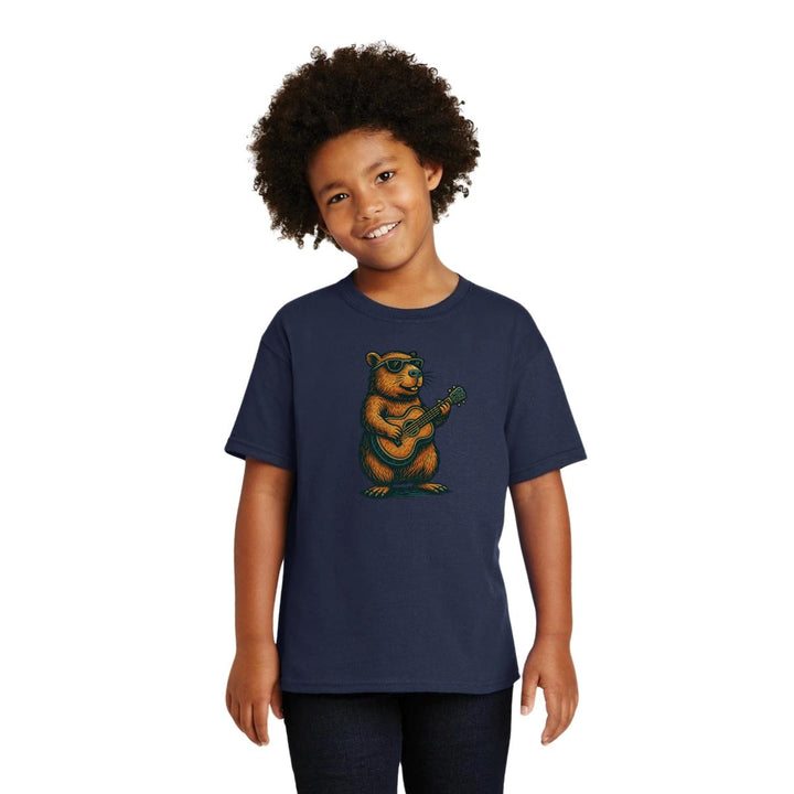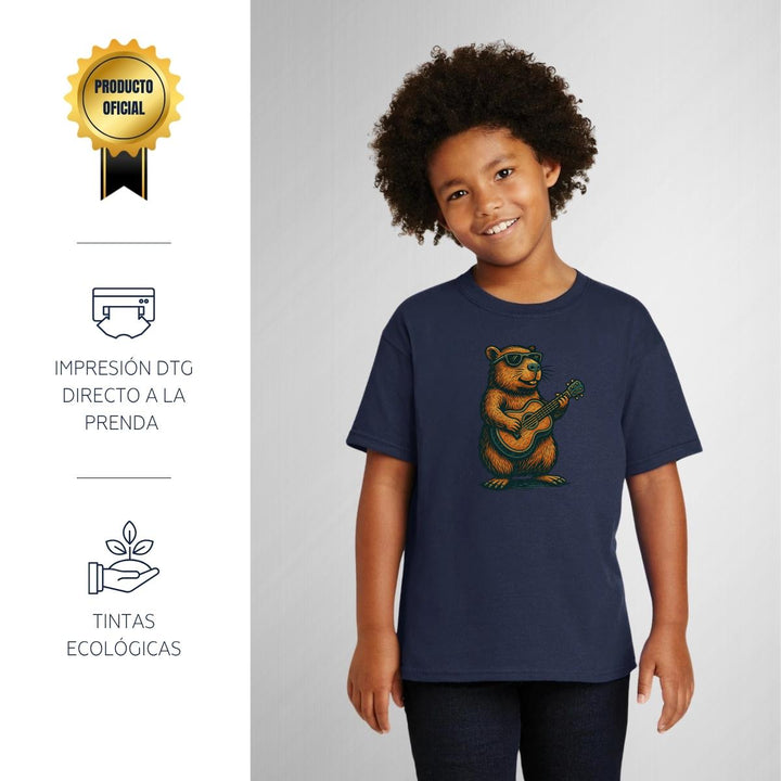 Playera infantil manga corta, cuello redondo para niño o niña nueva, diseño Capibara Carpincho Frases original impreso con tecnología DTG (directo a la prenda) tacto cero, uso casual o deportiva, 100% algodón chifón pre encogido, estructura tubular sin costuras laterales. Colores de camiseta: Negro, Blanco, Azul Marino.