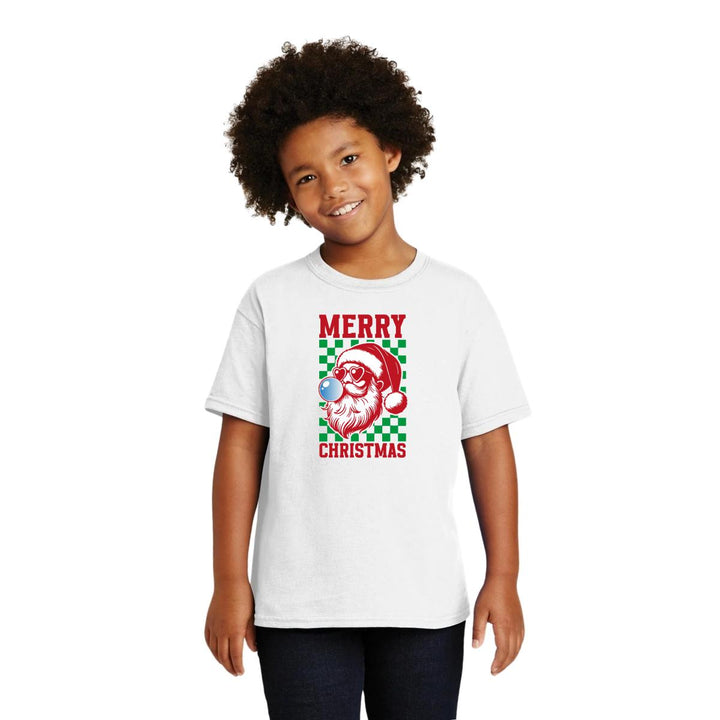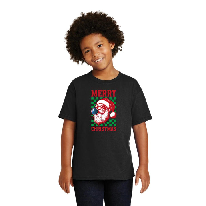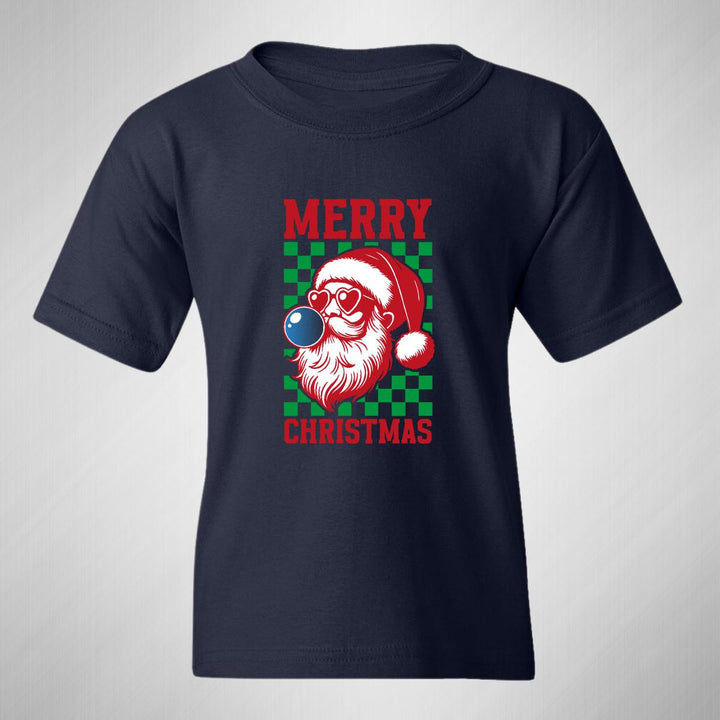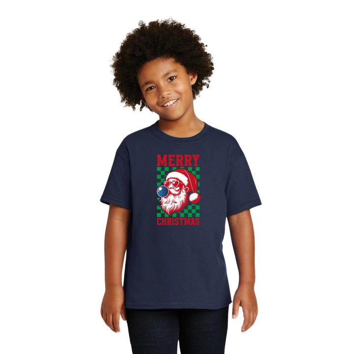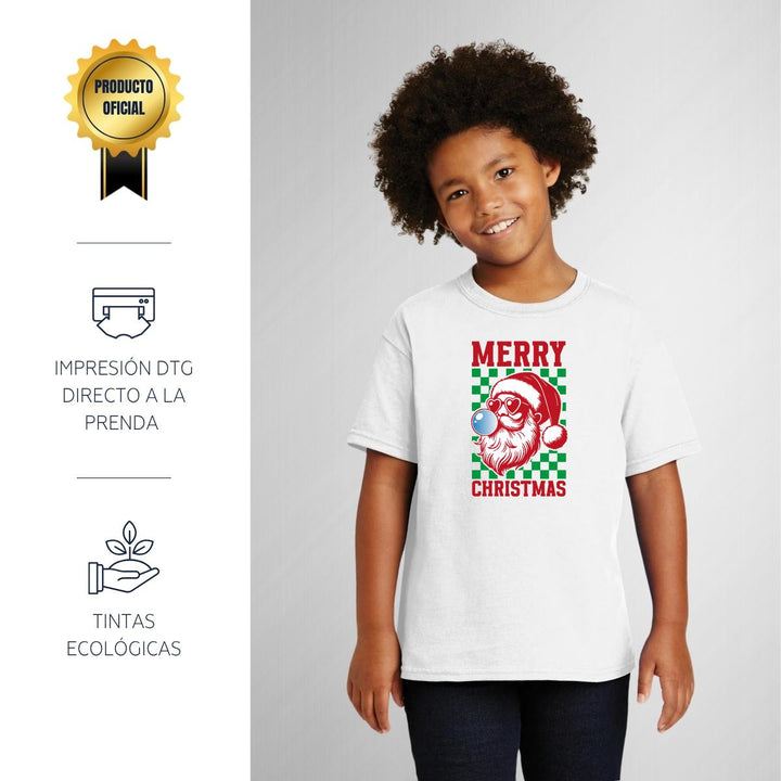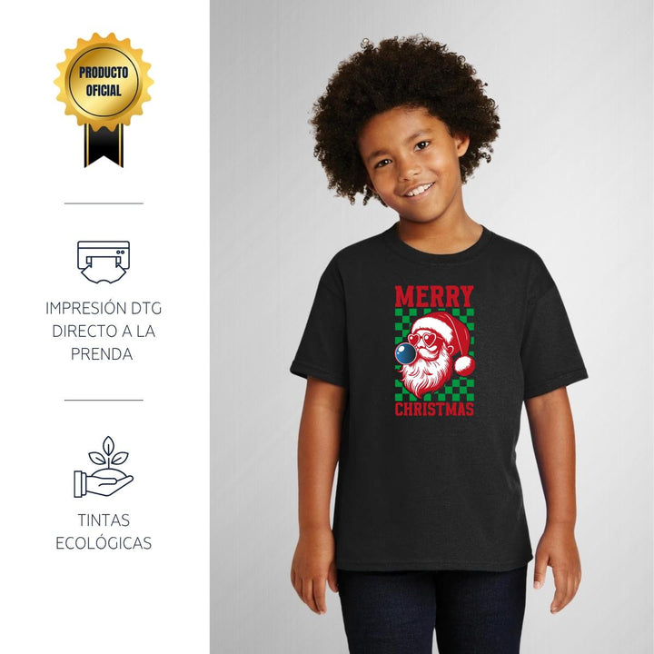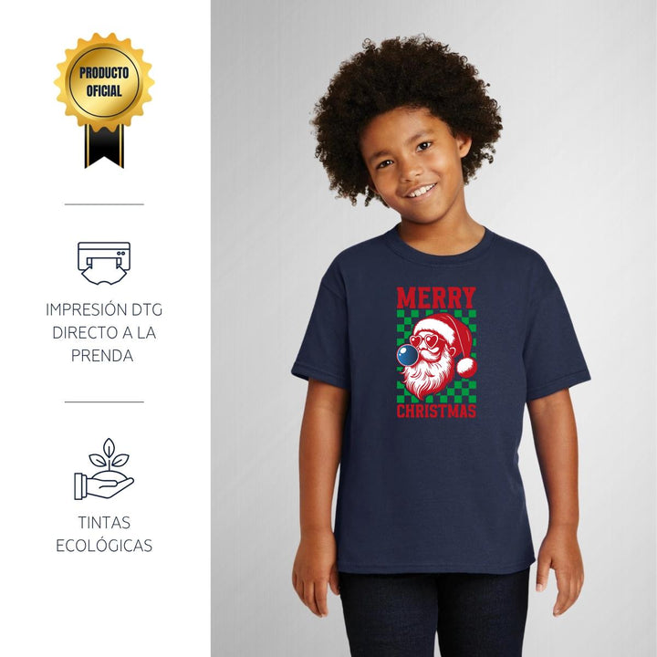 Playera infantil manga corta, cuello redondo para niño o niña nueva, diseño Merry Christmas original impreso con tecnología DTG (directo a la prenda) tacto cero, uso casual o deportiva, 100% algodón chifón pre encogido, estructura tubular sin costuras laterales. Colores de camiseta: Negro, Blanco, Azul Marino .