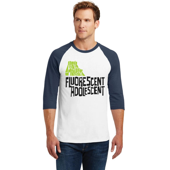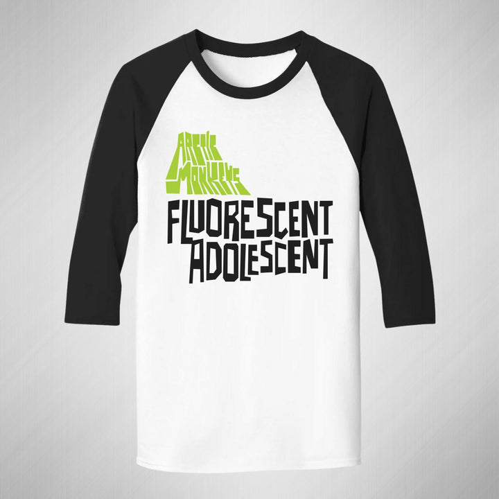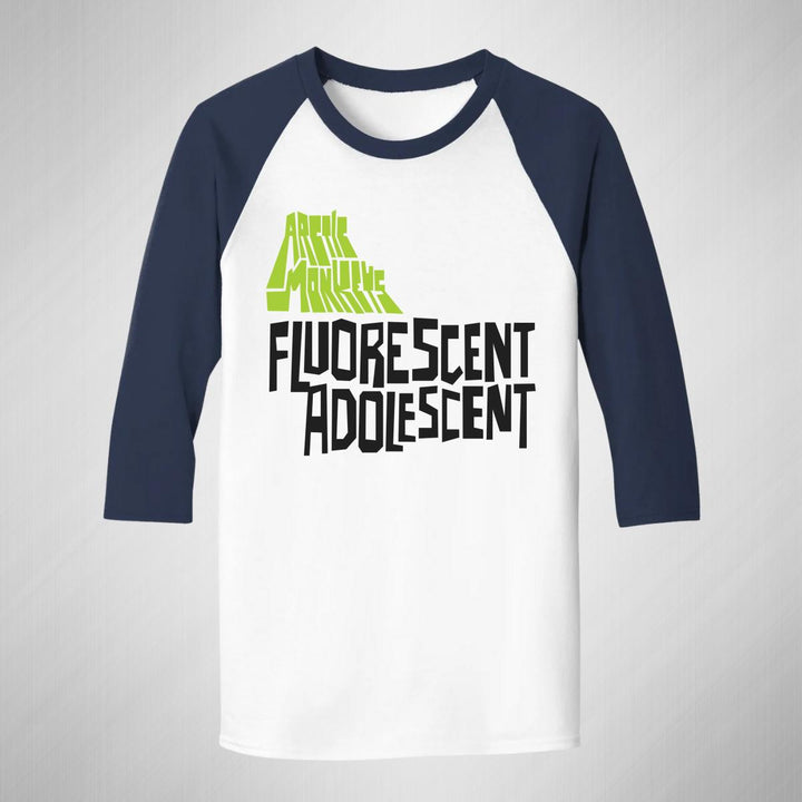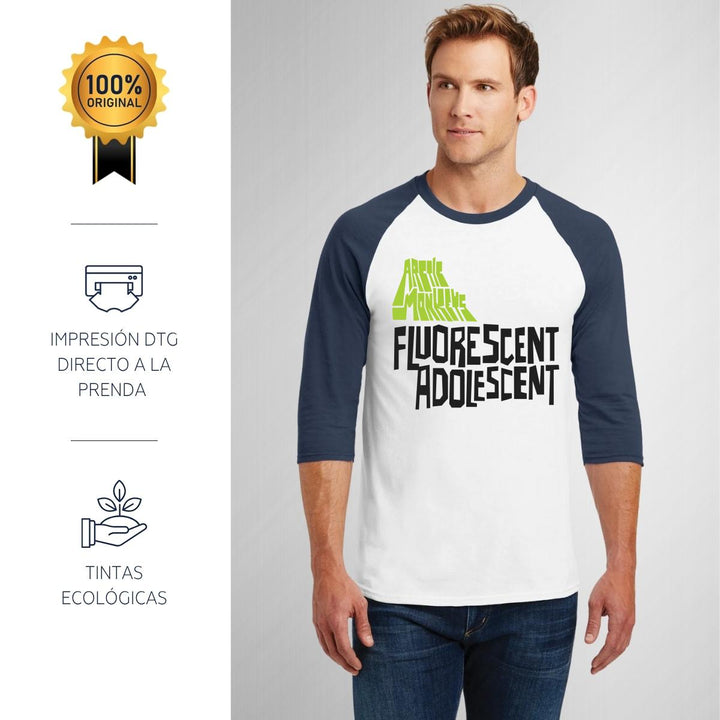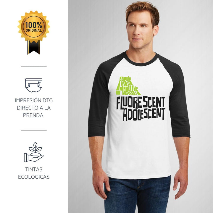 Playera de adulto raglán manga 3/4, cuello redondo para hombre nueva, diseño Artic Monkeys Fluorescent original impreso con tecnología DTG (directo a la prenda) tacto cero, uso casual o deportiva, 100% algodón pre encogido, estructura tubular sin costuras laterales. Colores de camiseta para caballero: Blanco-Negro, Blanco-Marino.
