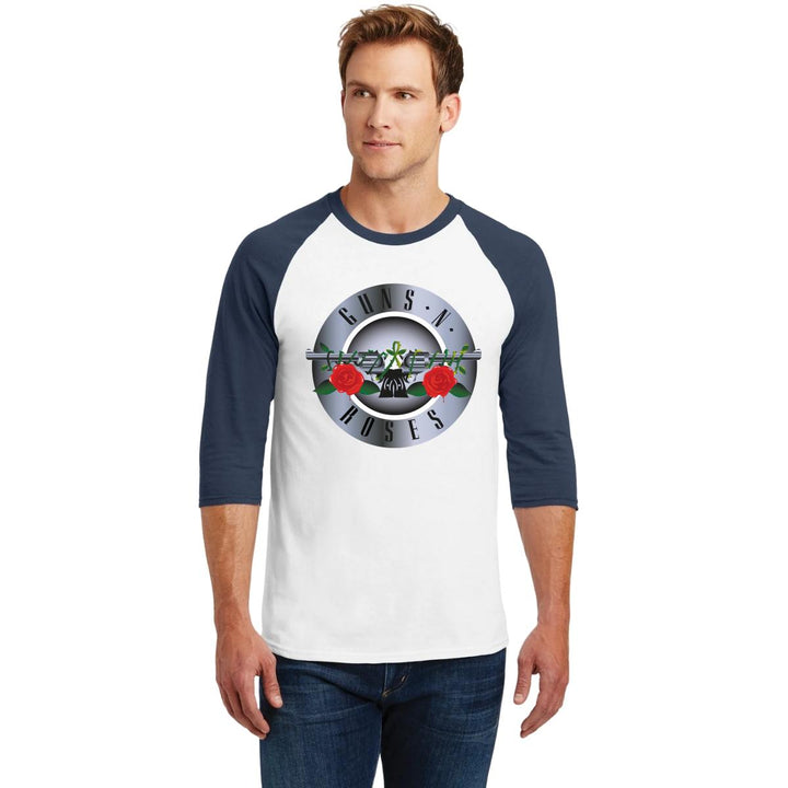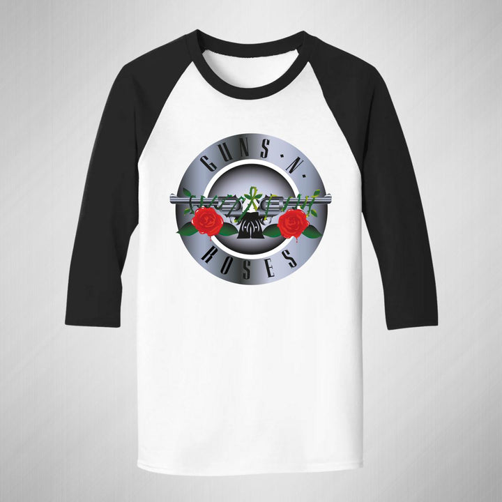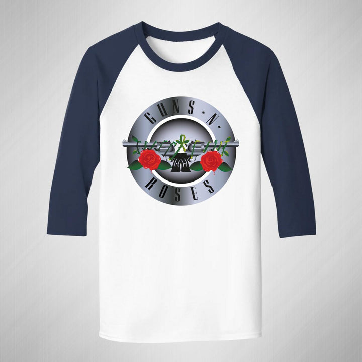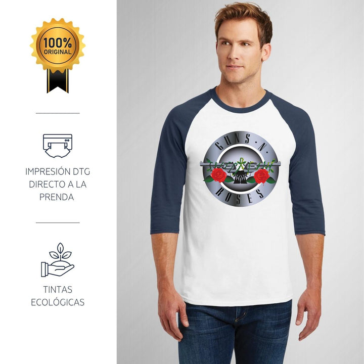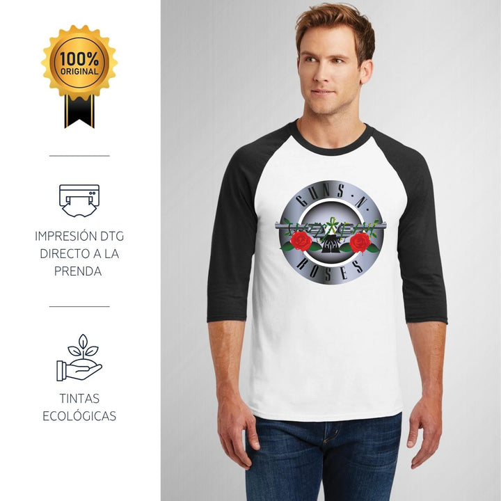 Playera de adulto raglán manga 3/4, cuello redondo para hombre nueva, diseño Guns N' Roses Bad obsession original impreso con tecnología DTG (directo a la prenda) tacto cero, uso casual o deportiva, 100% algodón pre encogido, estructura tubular sin costuras laterales. Colores de camiseta para caballero: Blanco-Negro, Blanco-Marino.