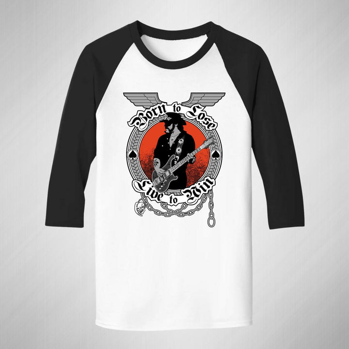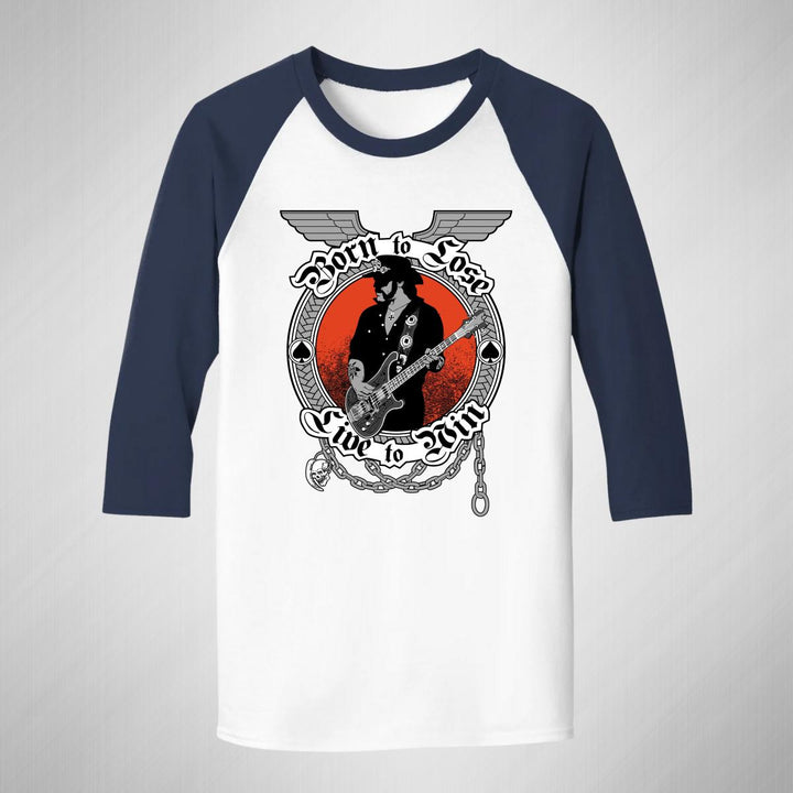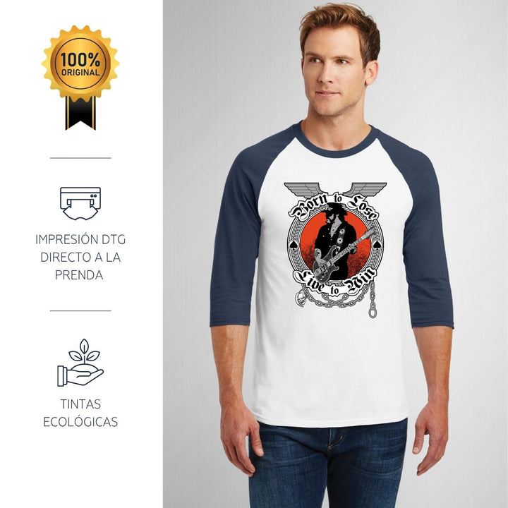 Playera de adulto raglán manga 3/4, cuello redondo para hombre nueva, diseño Motorhead Lemmy Kilmister original impreso con tecnología DTG (directo a la prenda) tacto cero, uso casual o deportiva, 100% algodón pre encogido, estructura tubular sin costuras laterales. Colores de camiseta para caballero: Blanco-Negro, Blanco-Marino.