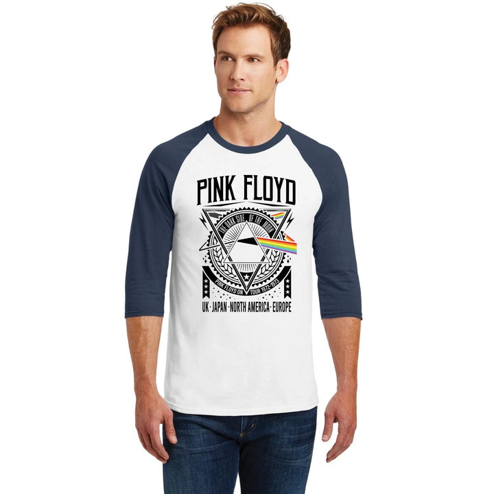 Playera de adulto raglán manga 3/4, cuello redondo para hombre nueva, diseño Pink Floyd Dark Side Moon original impreso con tecnología DTG (directo a la prenda) tacto cero, uso casual o deportiva, 100% algodón pre encogido, estructura tubular sin costuras laterales. Colores de camiseta para caballero: Blanco-Negro, Blanco-Marino.