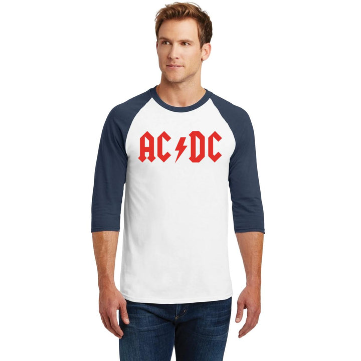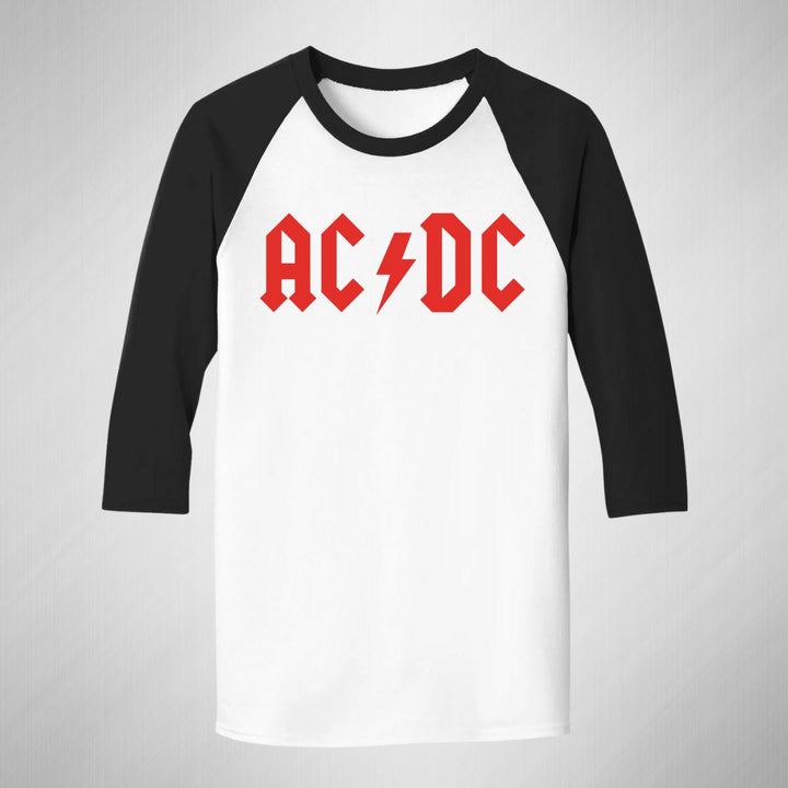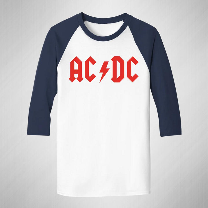 Playera de adulto raglán manga 3/4, cuello redondo para hombre nueva, diseño Rock AC/DC Logo original impreso con tecnología DTG (directo a la prenda) tacto cero, uso casual o deportiva, 100% algodón pre encogido, estructura tubular sin costuras laterales. Colores de camiseta para caballero: Blanco-Negro, Blanco-Marino.