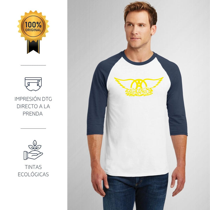 Playera de adulto raglán manga 3/4, cuello redondo para hombre nueva, diseño Rock Aerosmith Wings Logo original impreso con tecnología DTG (directo a la prenda) tacto cero, uso casual o deportiva, 100% algodón pre encogido, estructura tubular sin costuras laterales. Colores de camiseta para caballero: Blanco-Negro, Blanco-Marino.