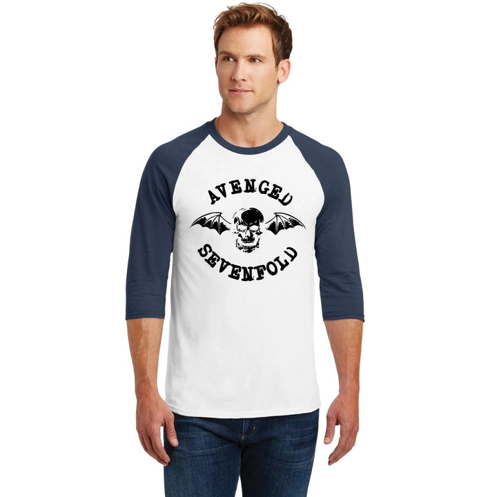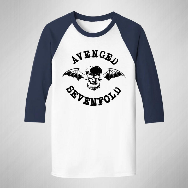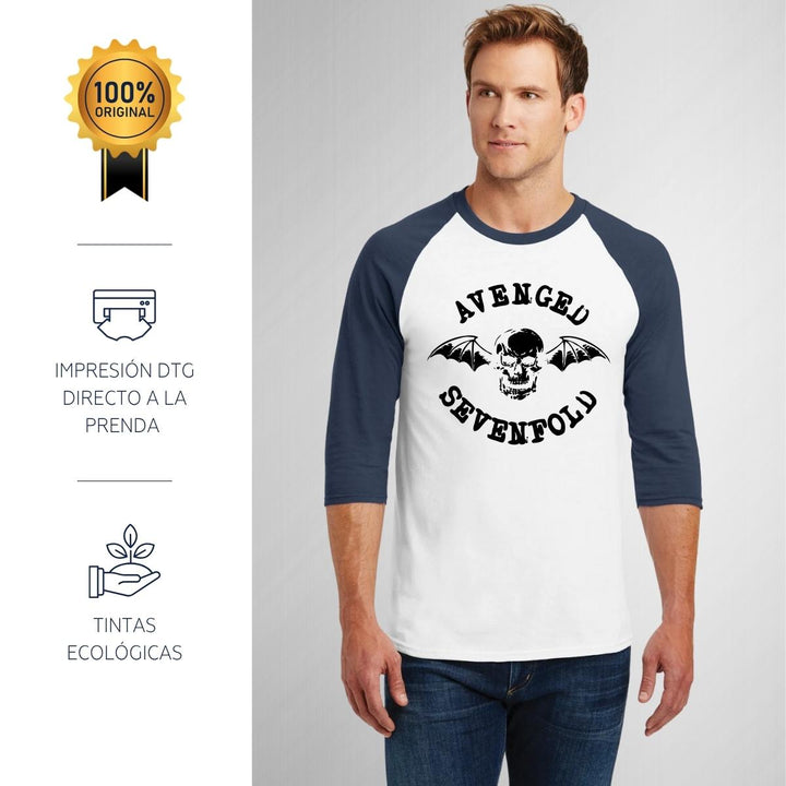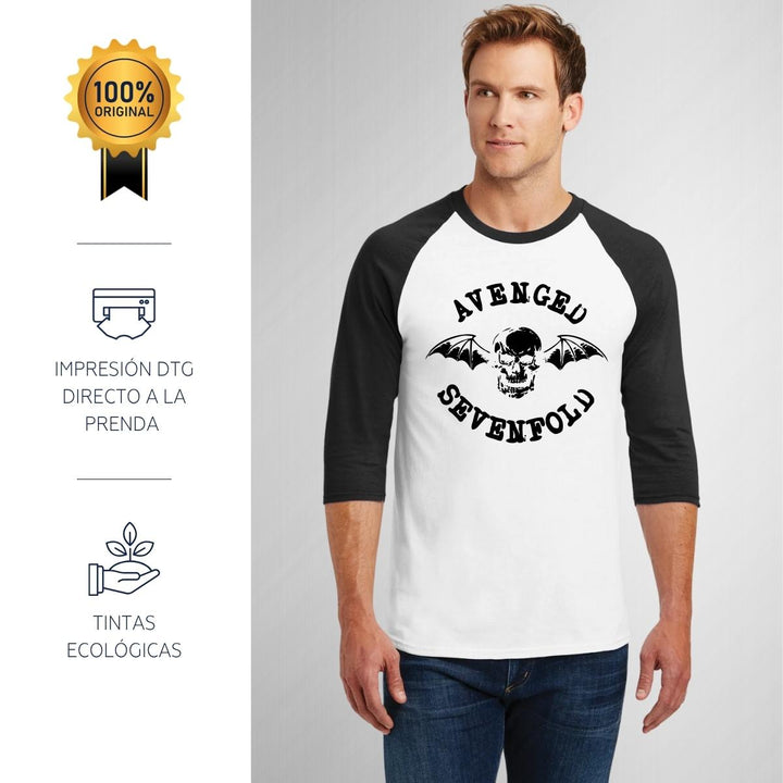 Playera de adulto raglán manga 3/4, cuello redondo para hombre nueva, diseño Rock Avenged Sevenfold Logo original impreso con tecnología DTG (directo a la prenda) tacto cero, uso casual o deportiva, 100% algodón pre encogido, estructura tubular sin costuras laterales. Colores de camiseta para caballero: Blanco-Negro, Blanco-Marino.