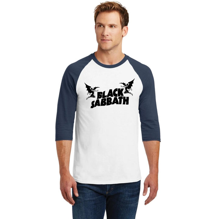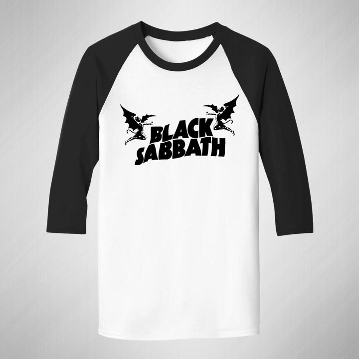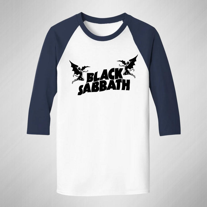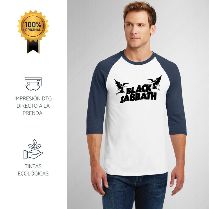 Playera de adulto raglán manga 3/4, cuello redondo para hombre nueva, diseño Rock Black Sabbath Logo original impreso con tecnología DTG (directo a la prenda) tacto cero, uso casual o deportiva, 100% algodón pre encogido, estructura tubular sin costuras laterales. Colores de camiseta para caballero: Blanco-Negro, Blanco-Marino.
