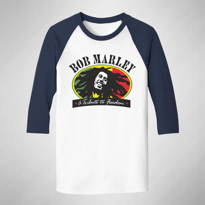 Playera de adulto raglán manga 3/4, cuello redondo para hombre nueva, diseño Rock Bob Marley A tribute original impreso con tecnología DTG (directo a la prenda) tacto cero, uso casual o deportiva, 100% algodón pre encogido, estructura tubular sin costuras laterales. Colores de camiseta para caballero: Blanco-Negro, Blanco-Marino.