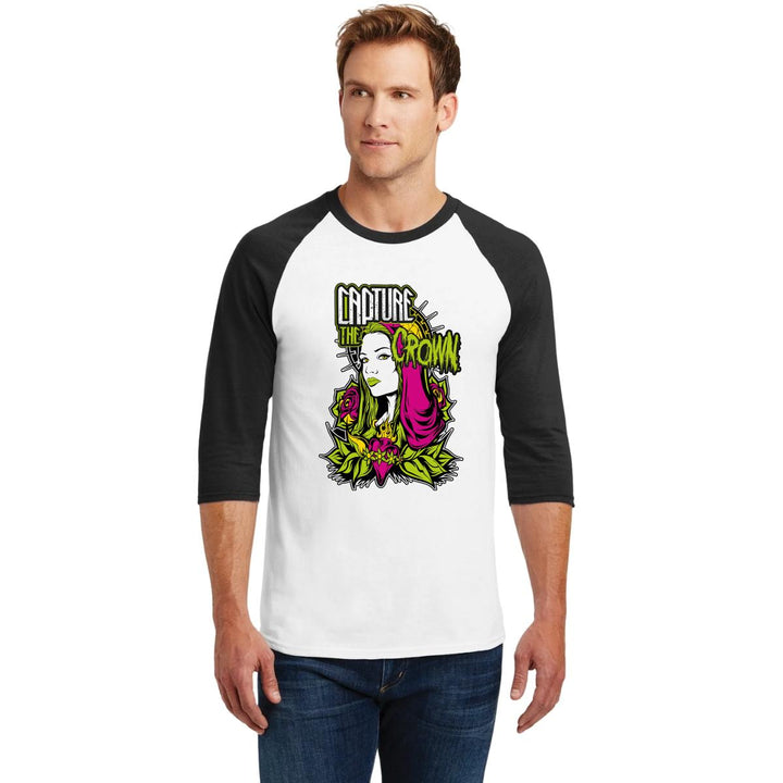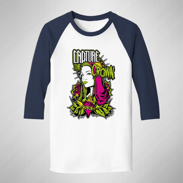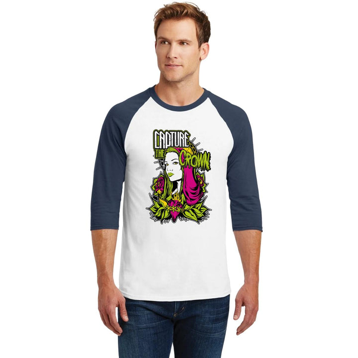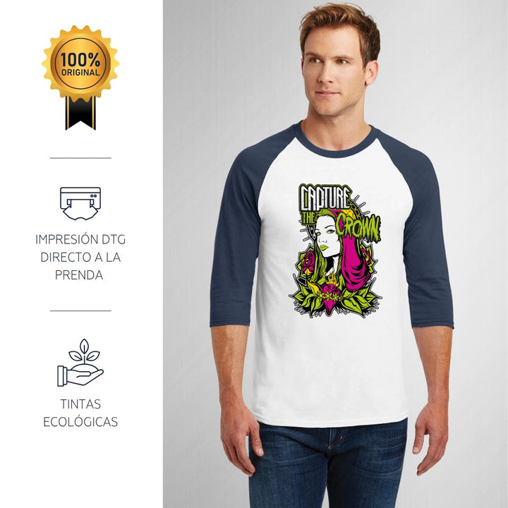 Playera de adulto raglán manga 3/4, cuello redondo para hombre nueva, diseño Rock Capture the crown original impreso con tecnología DTG (directo a la prenda) tacto cero, uso casual o deportiva, 100% algodón pre encogido, estructura tubular sin costuras laterales. Colores de camiseta para caballero: Blanco-Negro, Blanco-Marino.