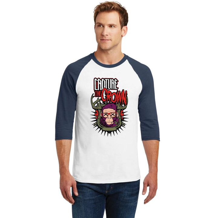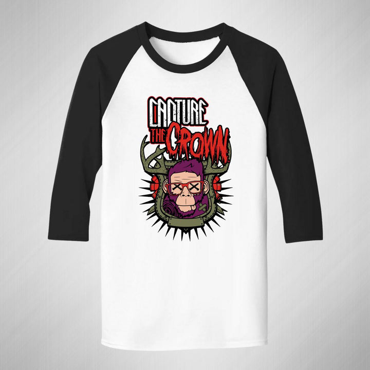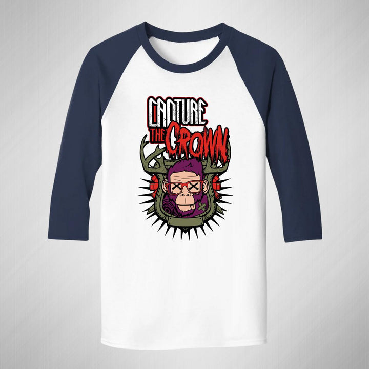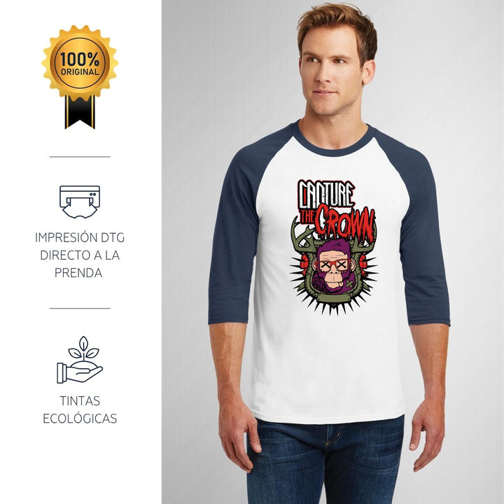 Playera de adulto raglán manga 3/4, cuello redondo para hombre nueva, diseño Rock Capture the crown original impreso con tecnología DTG (directo a la prenda) tacto cero, uso casual o deportiva, 100% algodón pre encogido, estructura tubular sin costuras laterales. Colores de camiseta para caballero: Blanco-Negro, Blanco-Marino.
