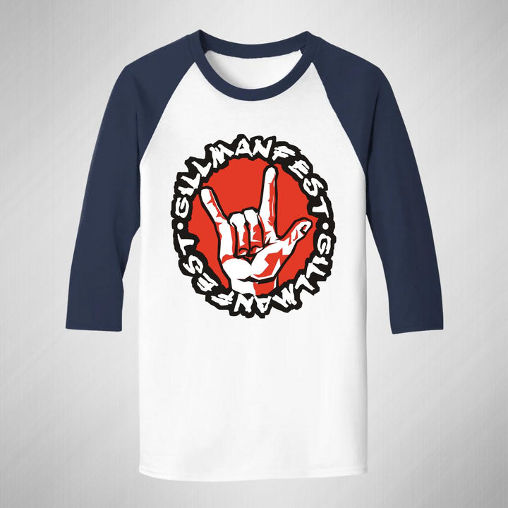 Playera de adulto raglán manga 3/4, cuello redondo para hombre nueva, diseño Rock Gilmanfest Logo original impreso con tecnología DTG (directo a la prenda) tacto cero, uso casual o deportiva, 100% algodón pre encogido, estructura tubular sin costuras laterales. Colores de camiseta para caballero: Blanco-Negro, Blanco-Marino.
