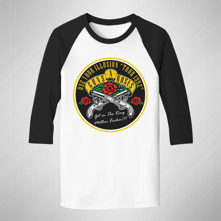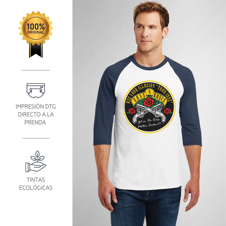 Playera de adulto raglán manga 3/4, cuello redondo para hombre nueva, diseño Rock Guns N' Roses Illusion original impreso con tecnología DTG (directo a la prenda) tacto cero, uso casual o deportiva, 100% algodón pre encogido, estructura tubular sin costuras laterales. Colores de camiseta para caballero: Blanco-Negro, Blanco-Marino.