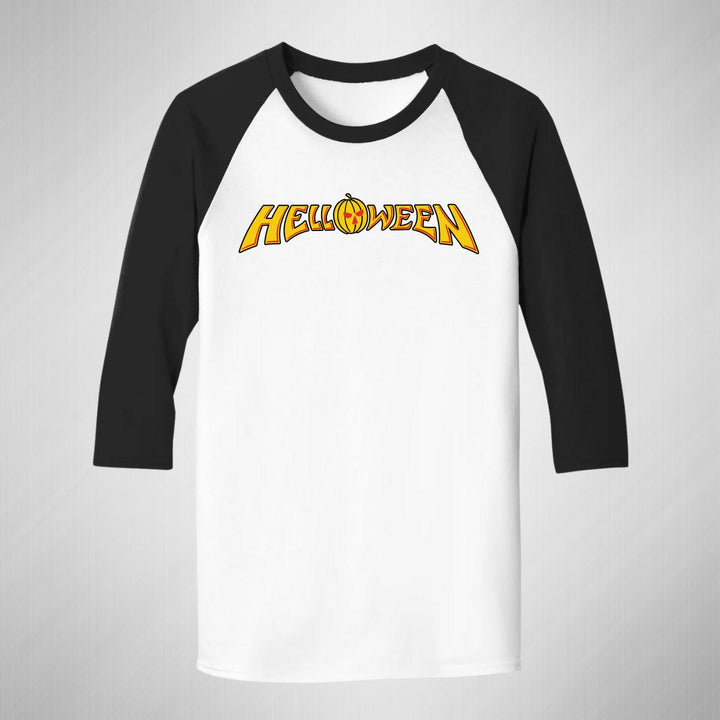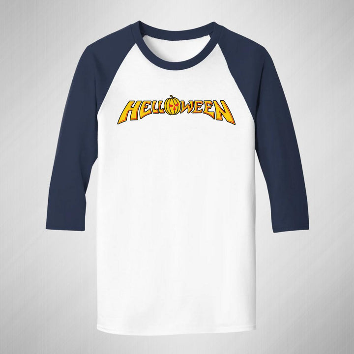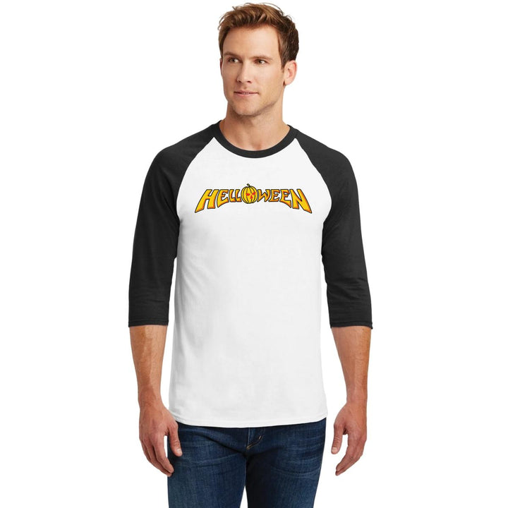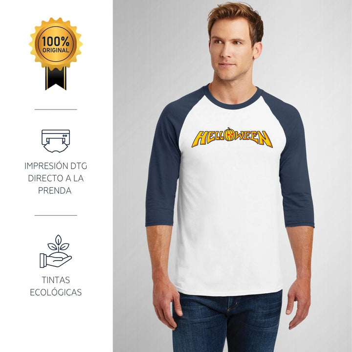 Playera de adulto raglán manga 3/4, cuello redondo para hombre nueva, diseño Rock Helloween Logo original impreso con tecnología DTG (directo a la prenda) tacto cero, uso casual o deportiva, 100% algodón pre encogido, estructura tubular sin costuras laterales. Colores de camiseta para caballero: Blanco-Negro, Blanco-Marino.