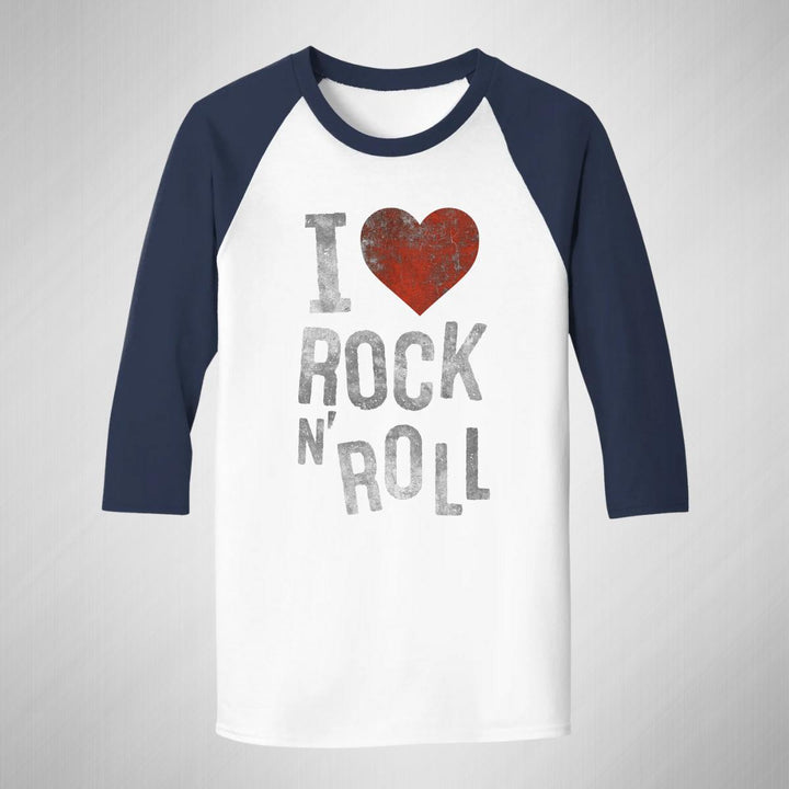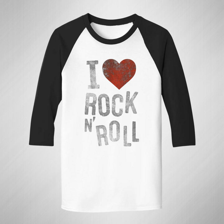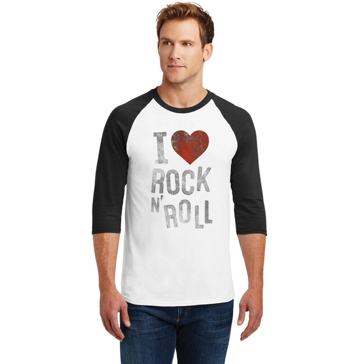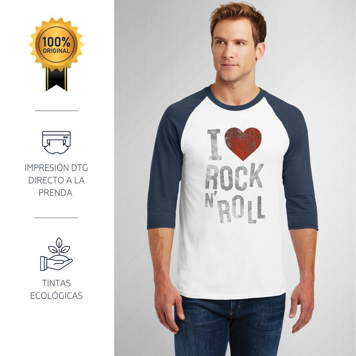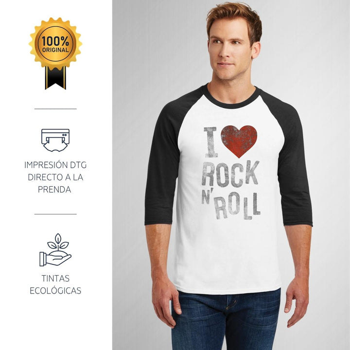 Playera de adulto raglán manga 3/4, cuello redondo para hombre nueva, diseño Rock I Love Rock and roll original impreso con tecnología DTG (directo a la prenda) tacto cero, uso casual o deportiva, 100% algodón pre encogido, estructura tubular sin costuras laterales. Colores de camiseta para caballero: Blanco-Negro, Blanco-Marino.