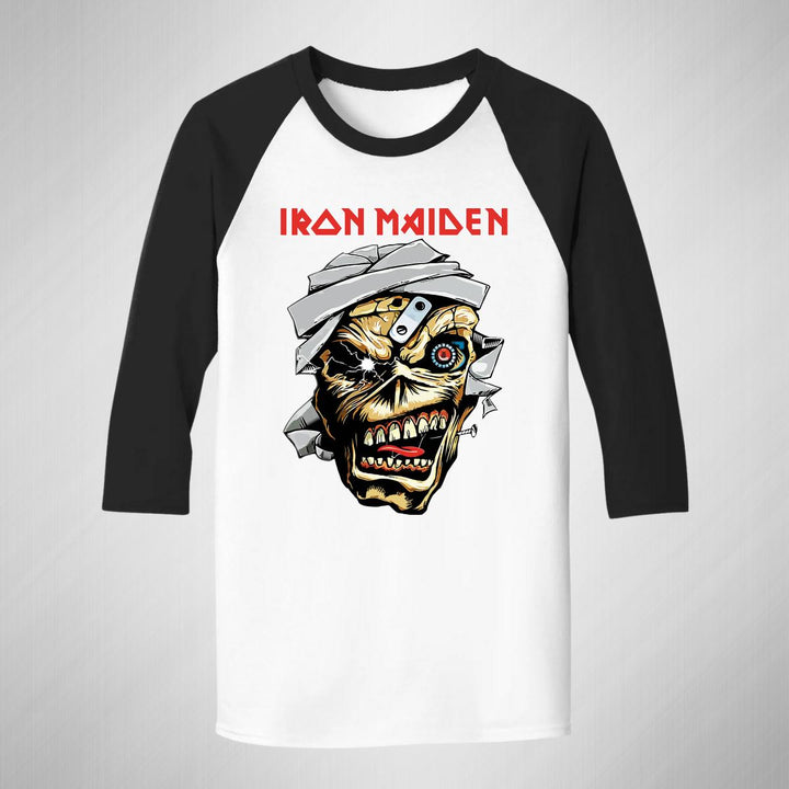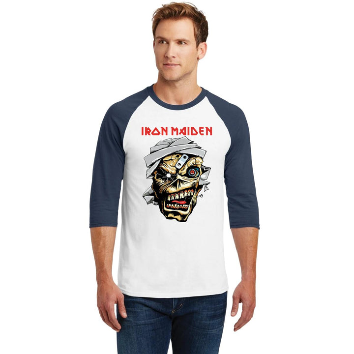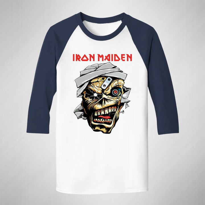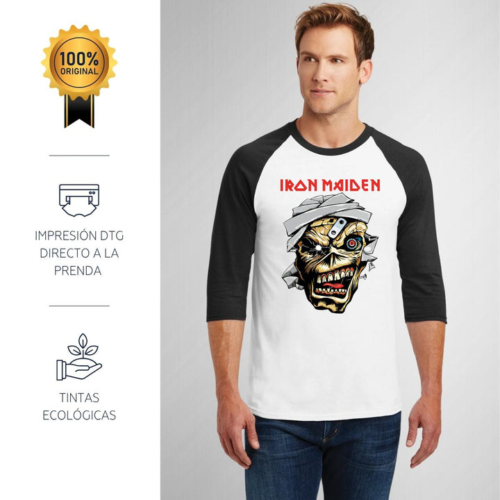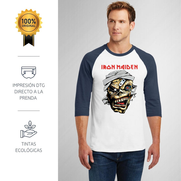 Playera de adulto raglán manga 3/4, cuello redondo para hombre nueva, diseño Rock Iron Maiden Póster original impreso con tecnología DTG (directo a la prenda) tacto cero, uso casual o deportiva, 100% algodón pre encogido, estructura tubular sin costuras laterales. Colores de camiseta para caballero: Blanco-Negro, Blanco-Marino.