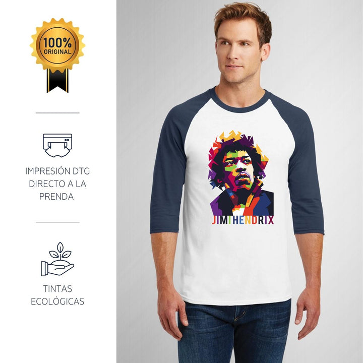 Playera de adulto raglán manga 3/4, cuello redondo para hombre nueva, diseño Rock Jimi Hendrix Póster original impreso con tecnología DTG (directo a la prenda) tacto cero, uso casual o deportiva, 100% algodón pre encogido, estructura tubular sin costuras laterales. Colores de camiseta para caballero: Blanco-Negro, Blanco-Marino.