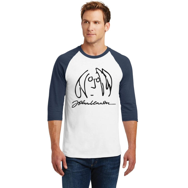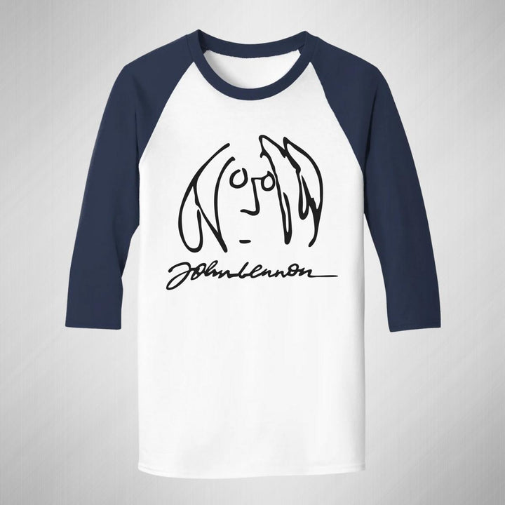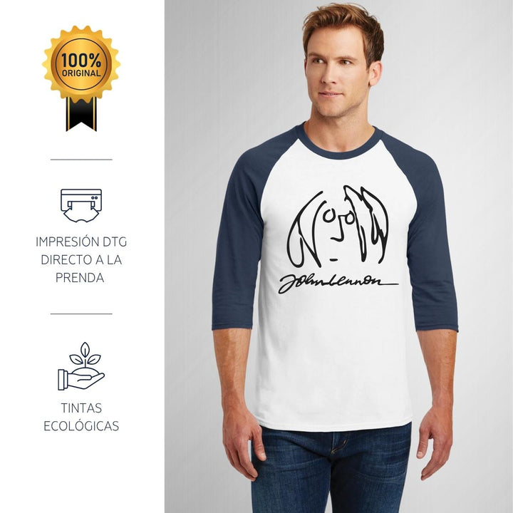 Playera de adulto raglán manga 3/4, cuello redondo para hombre nueva, diseño Rock John Lennon original impreso con tecnología DTG (directo a la prenda) tacto cero, uso casual o deportiva, 100% algodón pre encogido, estructura tubular sin costuras laterales. Colores de camiseta para caballero: Blanco-Negro, Blanco-Marino.
