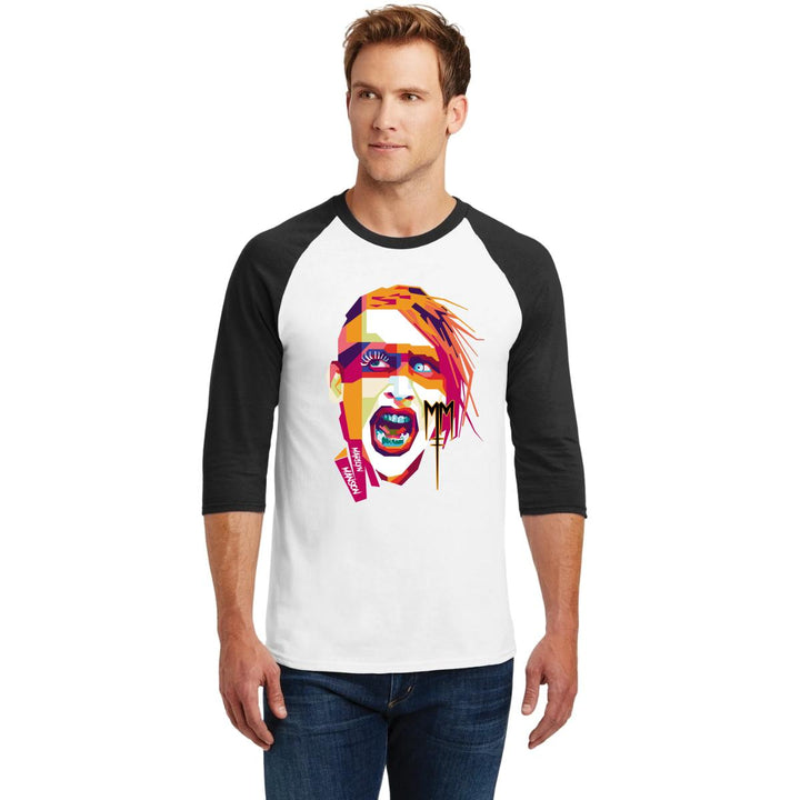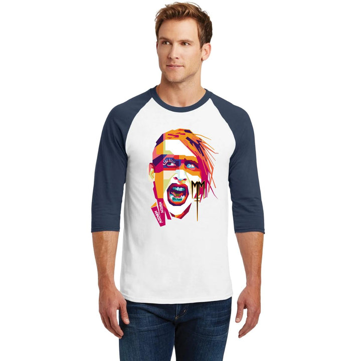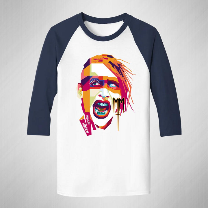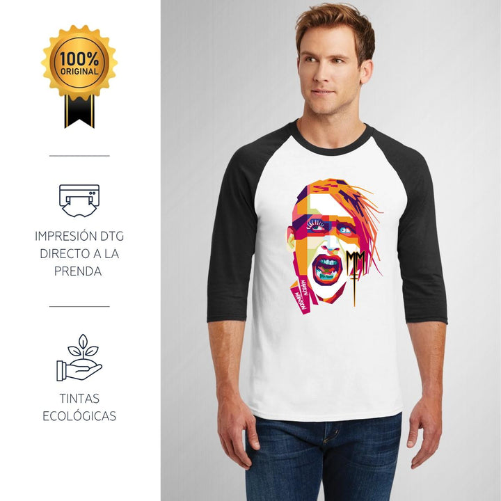 Playera de adulto raglán manga 3/4, cuello redondo para hombre nueva, diseño Rock Marilyn Manson original impreso con tecnología DTG (directo a la prenda) tacto cero, uso casual o deportiva, 100% algodón pre encogido, estructura tubular sin costuras laterales. Colores de camiseta para caballero: Blanco-Negro, Blanco-Marino.