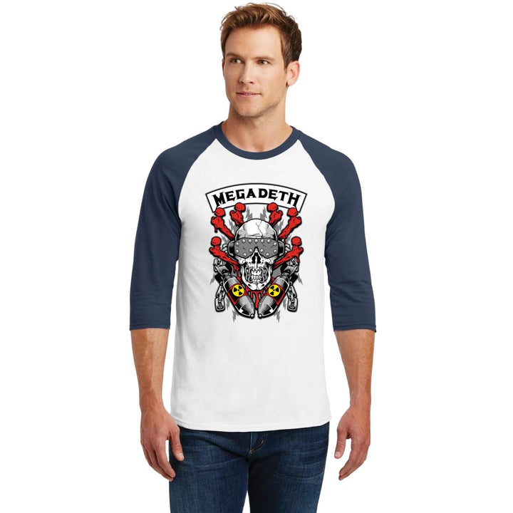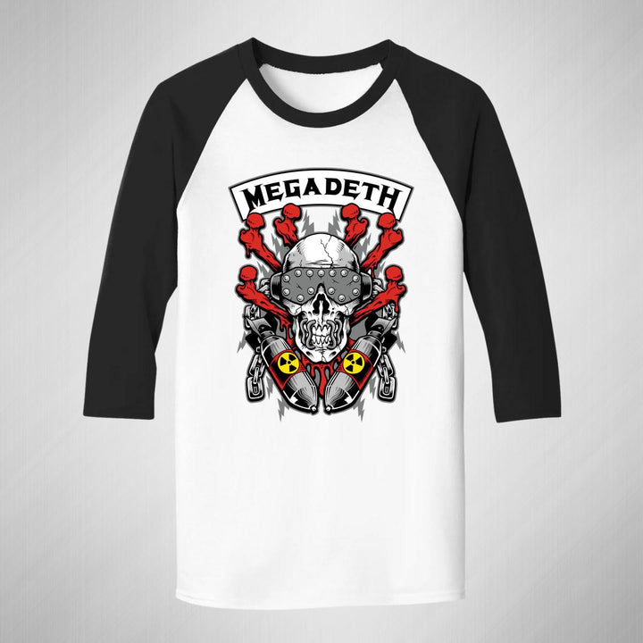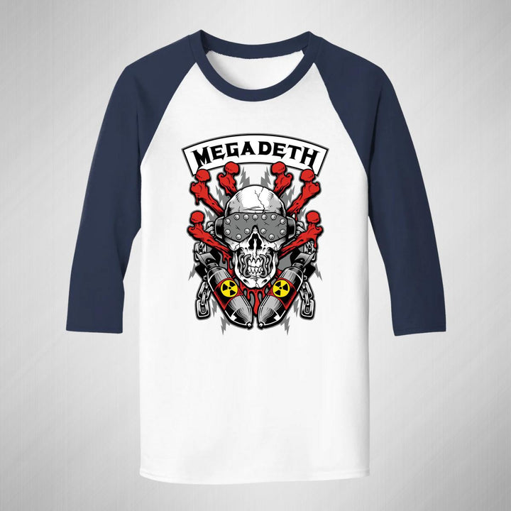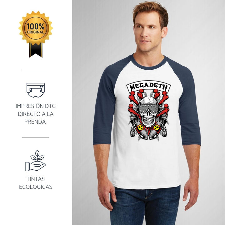 Playera de adulto raglán manga 3/4, cuello redondo para hombre nueva, diseño Rock Megadeth Ilustración original impreso con tecnología DTG (directo a la prenda) tacto cero, uso casual o deportiva, 100% algodón pre encogido, estructura tubular sin costuras laterales. Colores de camiseta para caballero: Blanco-Negro, Blanco-Marino.