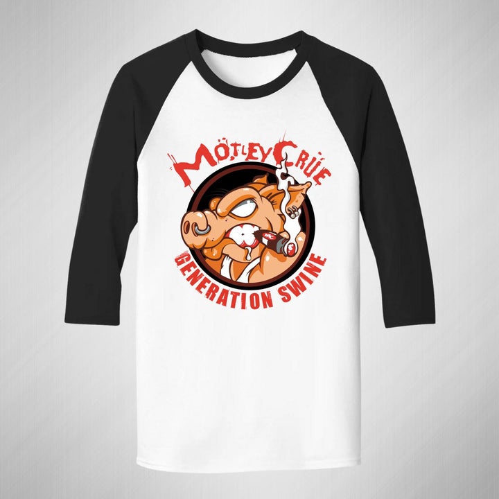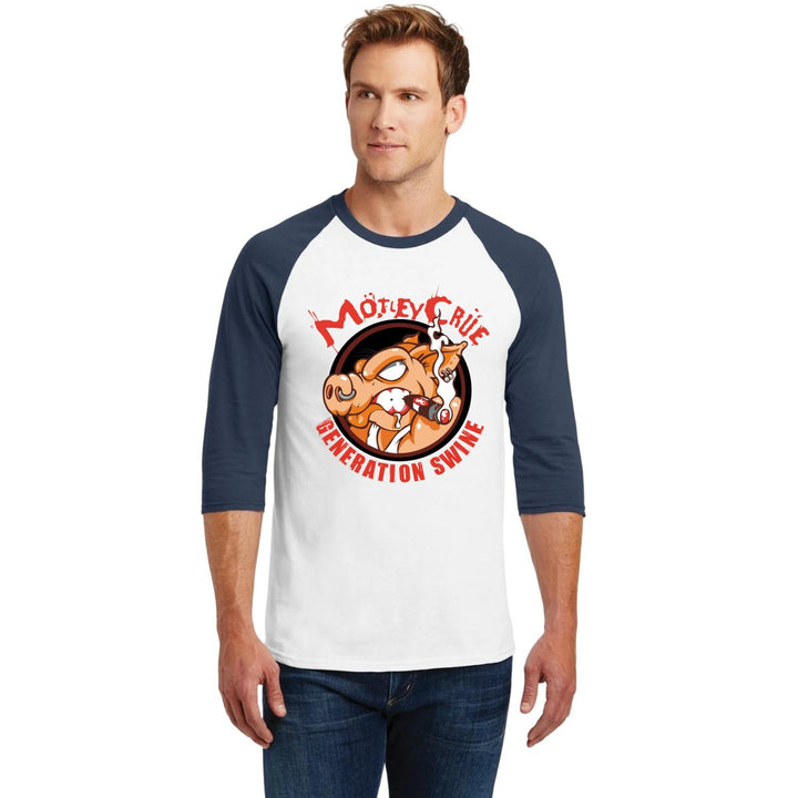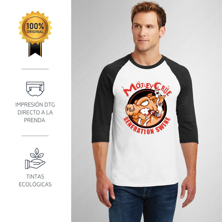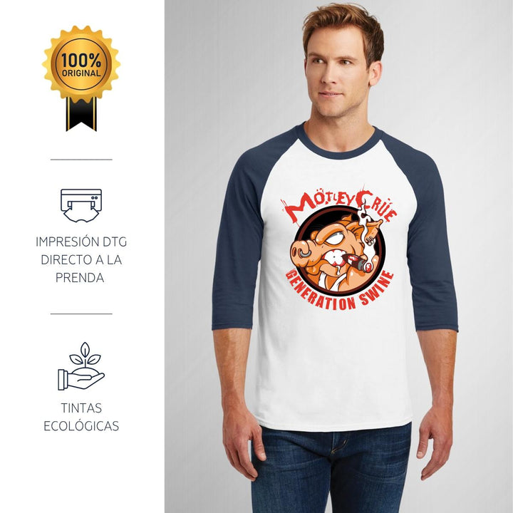 Playera de adulto raglán manga 3/4, cuello redondo para hombre nueva, diseño Rock Motley Crue Generation original impreso con tecnología DTG (directo a la prenda) tacto cero, uso casual o deportiva, 100% algodón pre encogido, estructura tubular sin costuras laterales. Colores de camiseta para caballero: Blanco-Negro, Blanco-Marino.