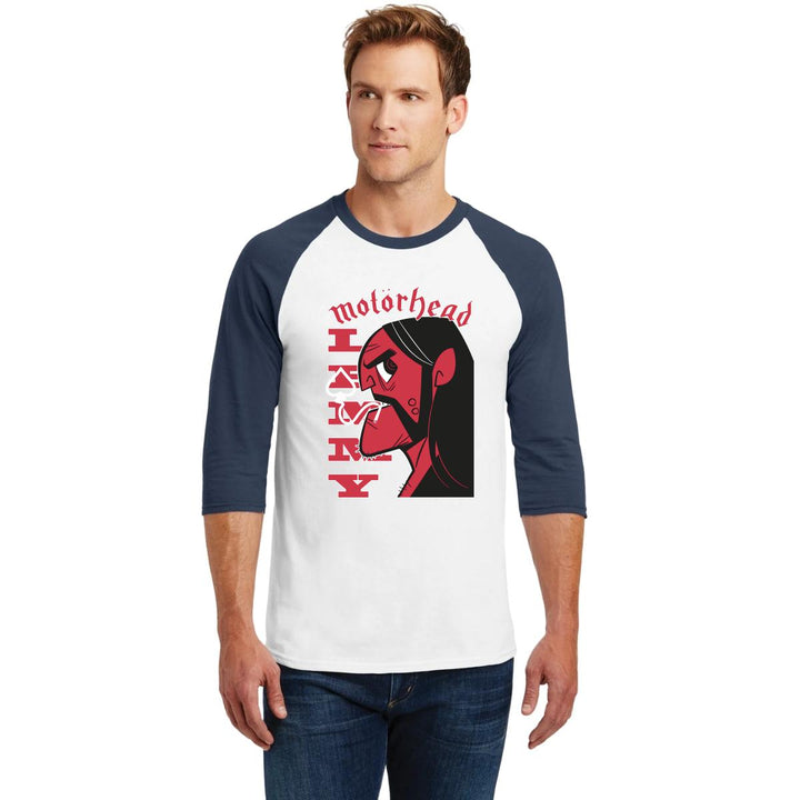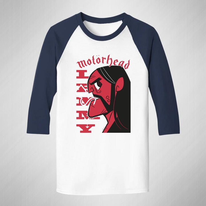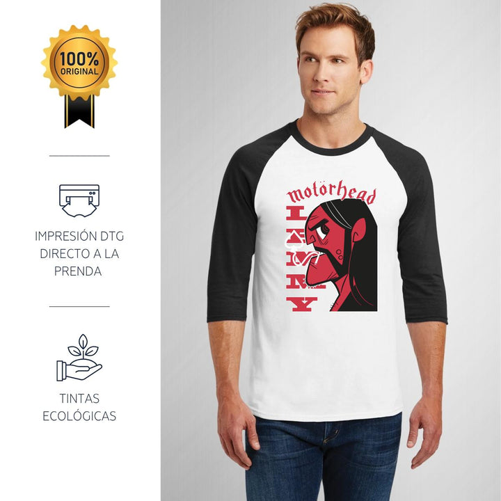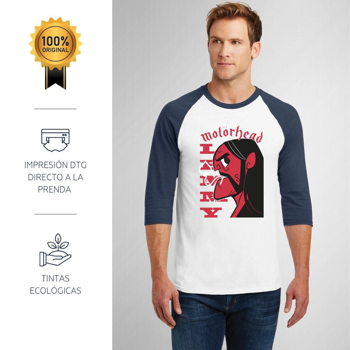 Playera de adulto raglán manga 3/4, cuello redondo para hombre nueva, diseño Rock Motorhead Lemmy original impreso con tecnología DTG (directo a la prenda) tacto cero, uso casual o deportiva, 100% algodón pre encogido, estructura tubular sin costuras laterales. Colores de camiseta para caballero: Blanco-Negro, Blanco-Marino.