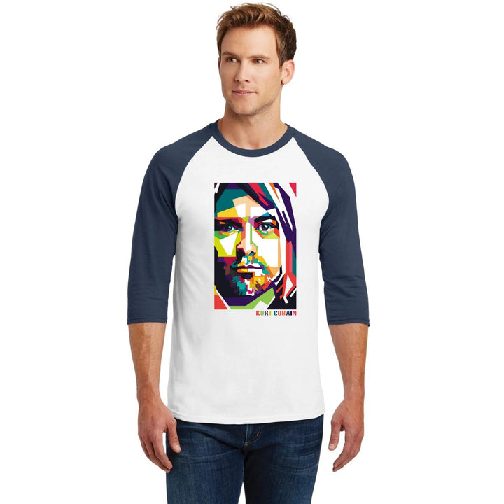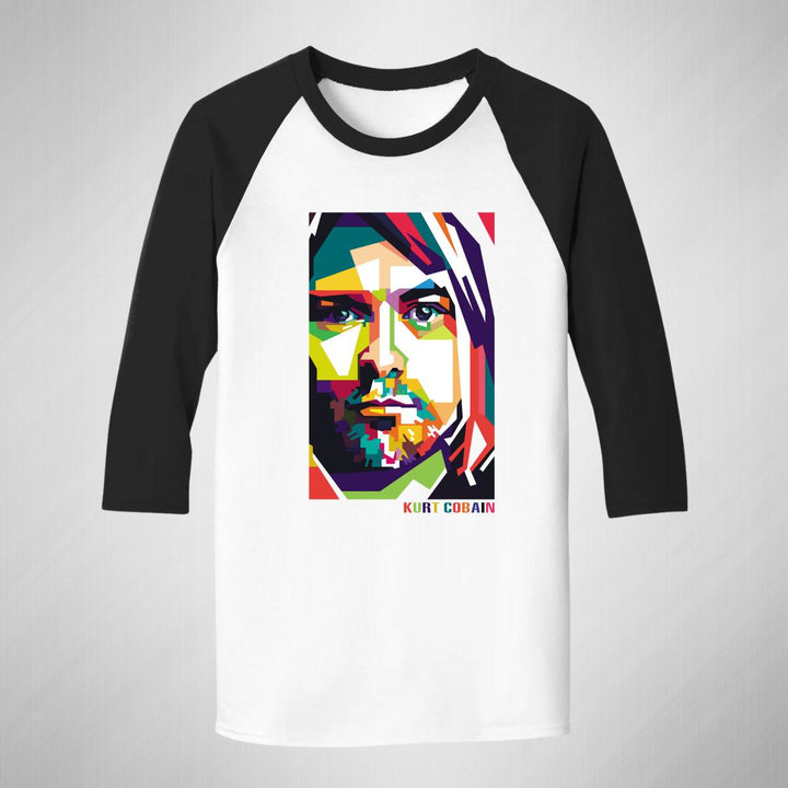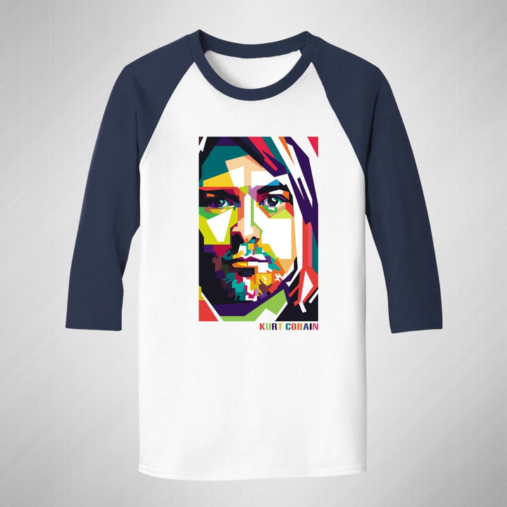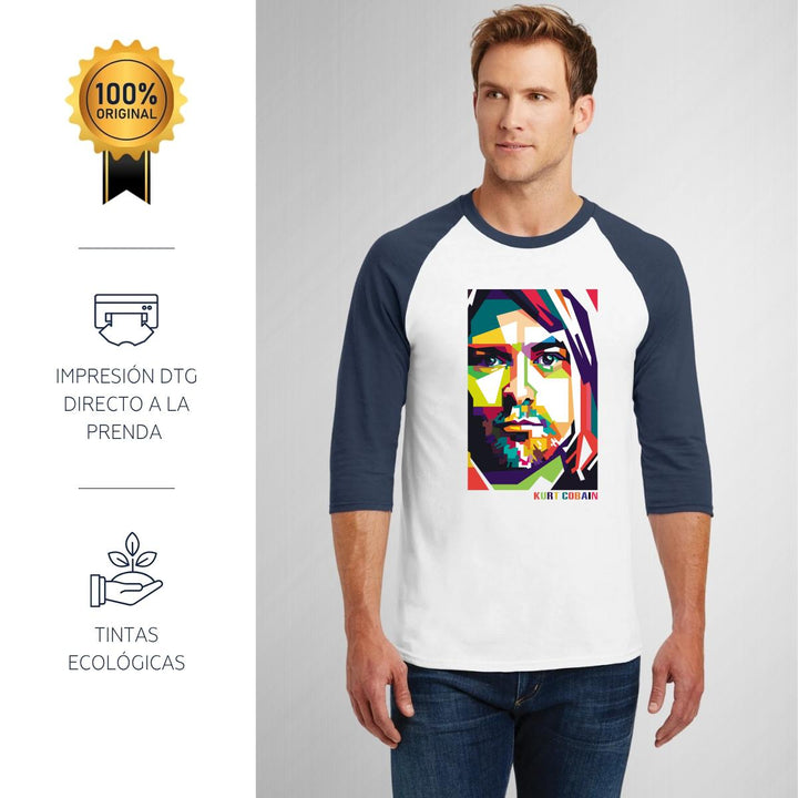Playera de adulto raglán manga 3/4, cuello redondo para hombre nueva, diseño Rock Nirvana Kurt Cobain original impreso con tecnología DTG (directo a la prenda) tacto cero, uso casual o deportiva, 100% algodón pre encogido, estructura tubular sin costuras laterales. Colores de camiseta para caballero: Blanco-Negro, Blanco-Marino.