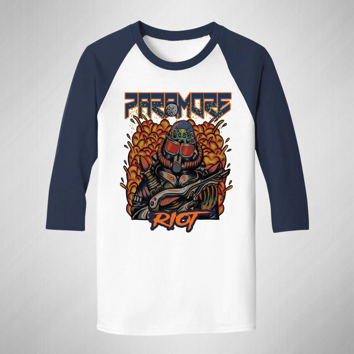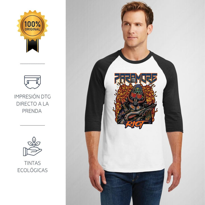 Playera de adulto raglán manga 3/4, cuello redondo para hombre nueva, diseño Rock Paramore Ilustración original impreso con tecnología DTG (directo a la prenda) tacto cero, uso casual o deportiva, 100% algodón pre encogido, estructura tubular sin costuras laterales. Colores de camiseta para caballero: Blanco-Negro, Blanco-Marino.