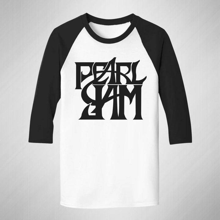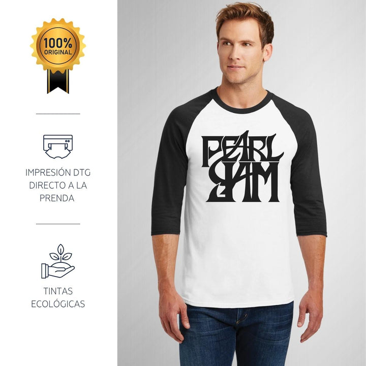 Playera de adulto raglán manga 3/4, cuello redondo para hombre nueva, diseño Rock Pearl Jam Logo original impreso con tecnología DTG (directo a la prenda) tacto cero, uso casual o deportiva, 100% algodón pre encogido, estructura tubular sin costuras laterales. Colores de camiseta para caballero: Blanco-Negro, Blanco-Marino.
