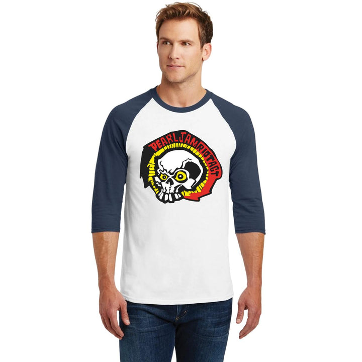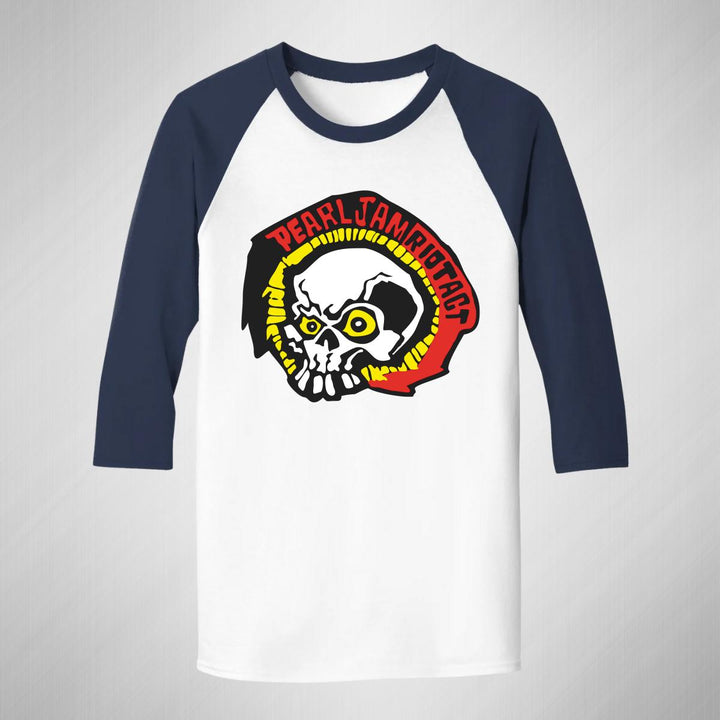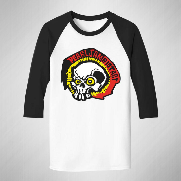 Playera de adulto raglán manga 3/4, cuello redondo para hombre nueva, diseño Rock Pearl Jam Riotact original impreso con tecnología DTG (directo a la prenda) tacto cero, uso casual o deportiva, 100% algodón pre encogido, estructura tubular sin costuras laterales. Colores de camiseta para caballero: Blanco-Negro, Blanco-Marino.