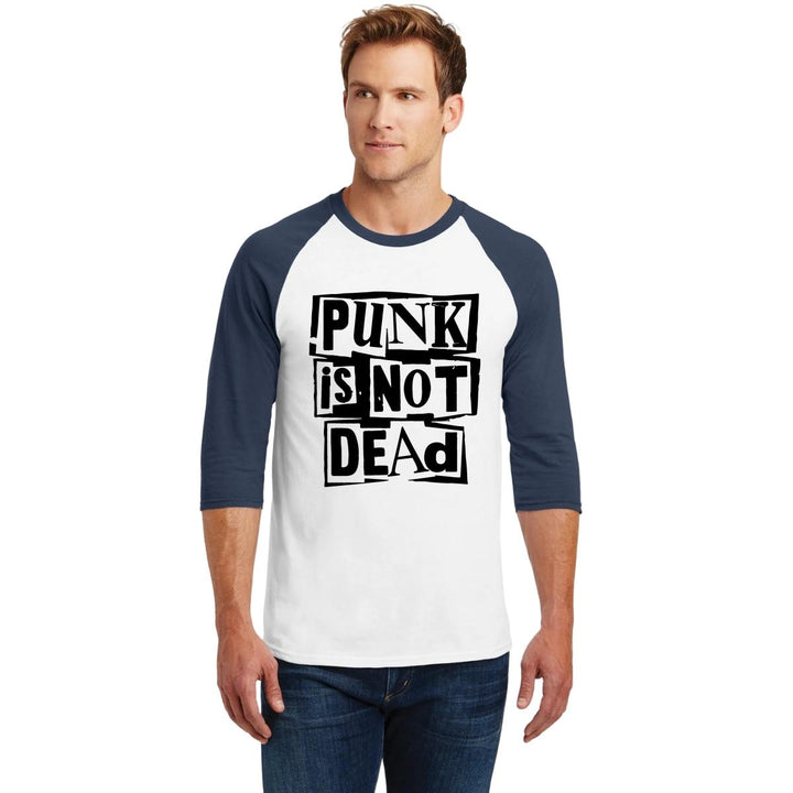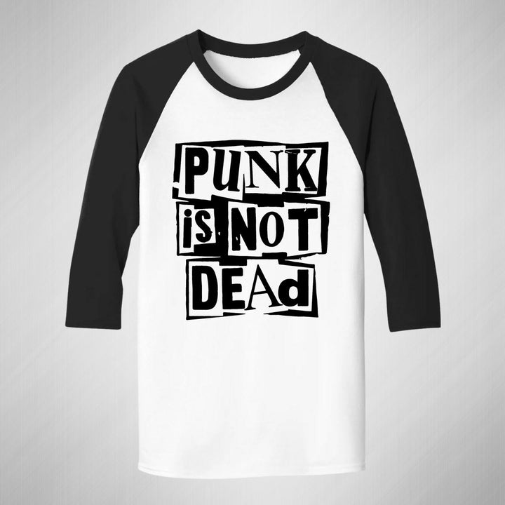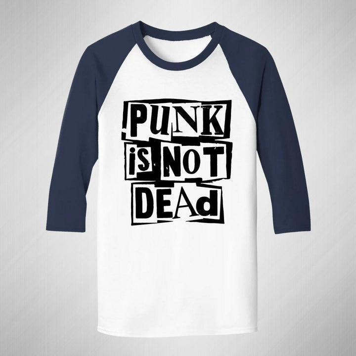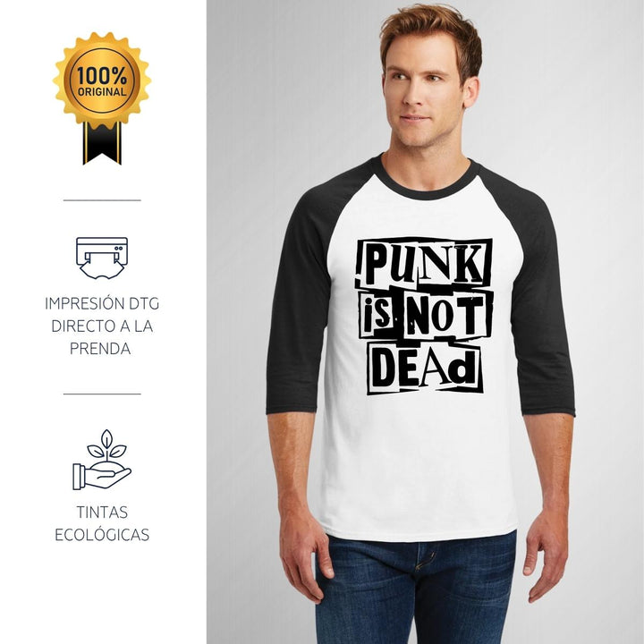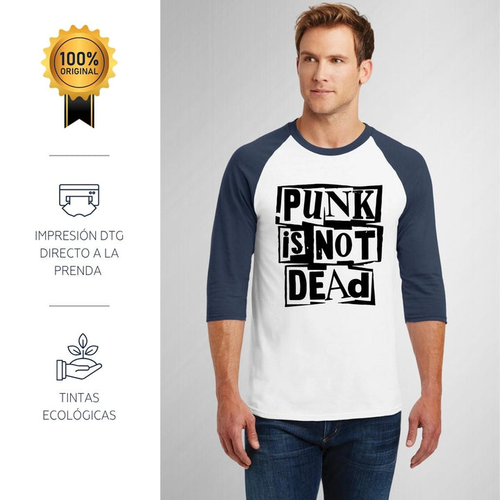 Playera de adulto raglán manga 3/4, cuello redondo para hombre nueva, diseño Rock Punk Is not dead original impreso con tecnología DTG (directo a la prenda) tacto cero, uso casual o deportiva, 100% algodón pre encogido, estructura tubular sin costuras laterales. Colores de camiseta para caballero: Blanco-Negro, Blanco-Marino.