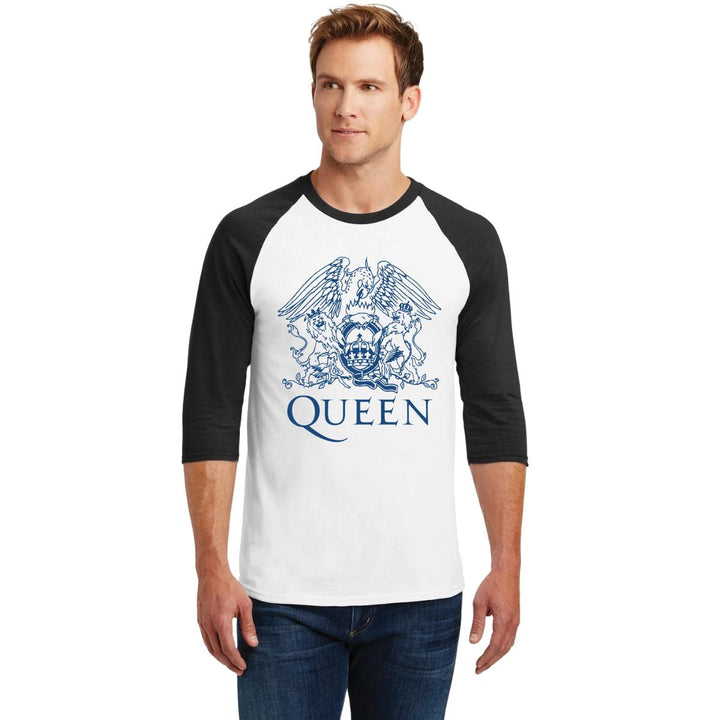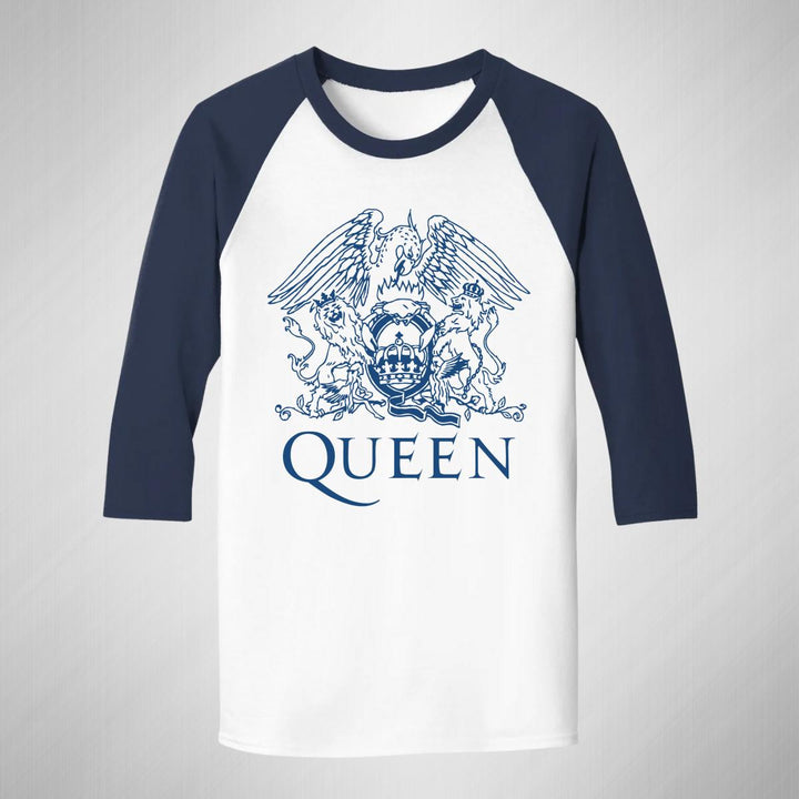Playera de adulto raglán manga 3/4, cuello redondo para hombre nueva, diseño Rock Queen Logo original impreso con tecnología DTG (directo a la prenda) tacto cero, uso casual o deportiva, 100% algodón pre encogido, estructura tubular sin costuras laterales. Colores de camiseta para caballero: Blanco-Negro, Blanco-Marino.