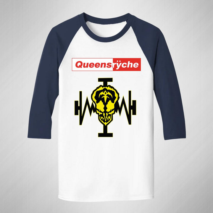 Playera de adulto raglán manga 3/4, cuello redondo para hombre nueva, diseño Rock Queensryche Póster original impreso con tecnología DTG (directo a la prenda) tacto cero, uso casual o deportiva, 100% algodón pre encogido, estructura tubular sin costuras laterales. Colores de camiseta para caballero: Blanco-Negro, Blanco-Marino.
