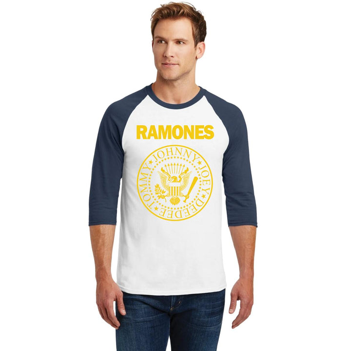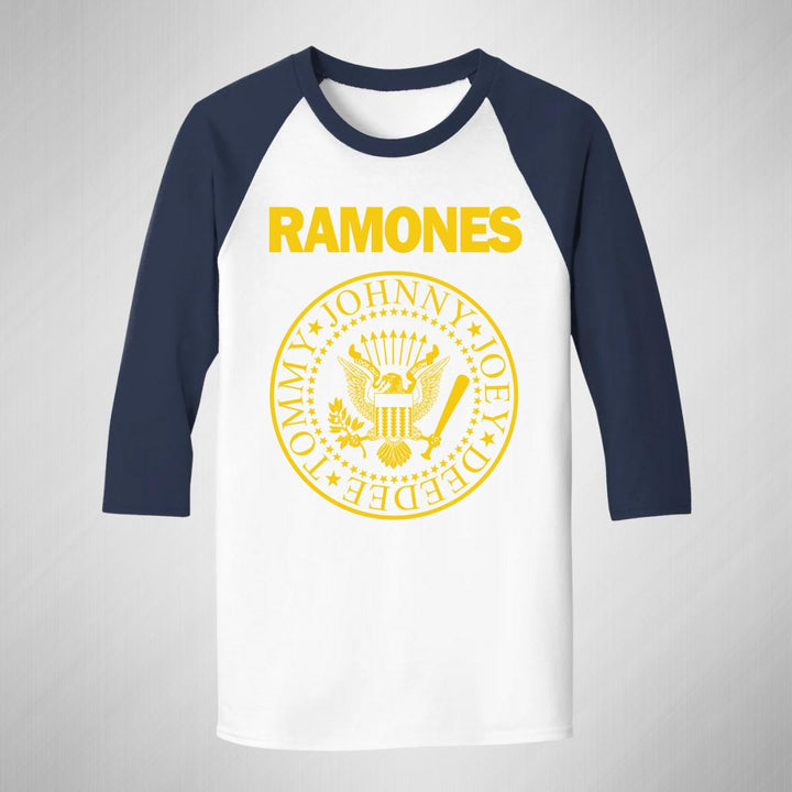 Playera de adulto raglán manga 3/4, cuello redondo para hombre nueva, diseño Rock Ramones Logo original impreso con tecnología DTG (directo a la prenda) tacto cero, uso casual o deportiva, 100% algodón pre encogido, estructura tubular sin costuras laterales. Colores de camiseta para caballero: Blanco-Negro, Blanco-Marino.
