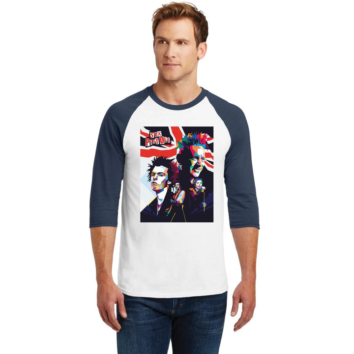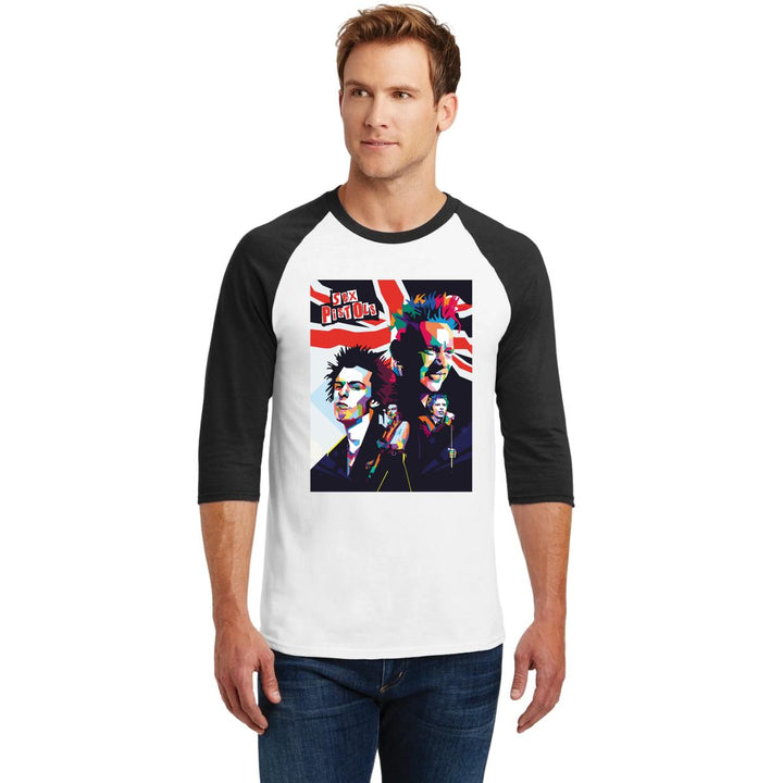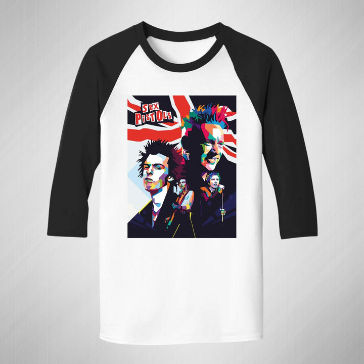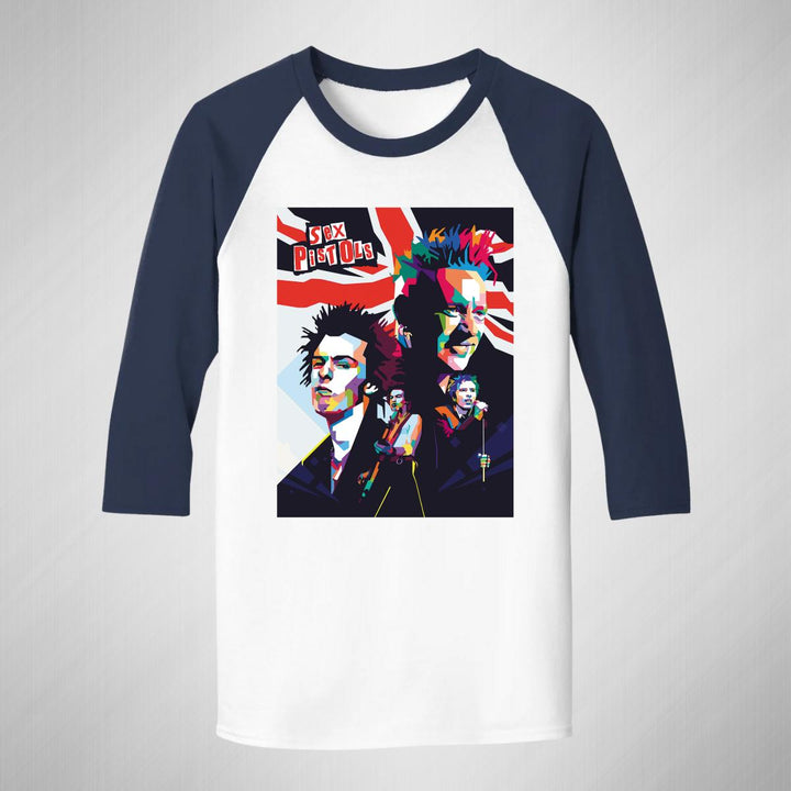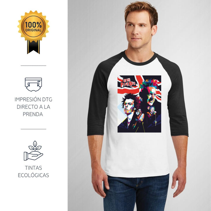 Playera de adulto raglán manga 3/4, cuello redondo para hombre nueva, diseño Rock Sex Pistols original impreso con tecnología DTG (directo a la prenda) tacto cero, uso casual o deportiva, 100% algodón pre encogido, estructura tubular sin costuras laterales. Colores de camiseta para caballero: Blanco-Negro, Blanco-Marino.