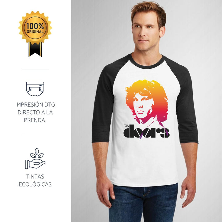 Playera de adulto raglán manga 3/4, cuello redondo para hombre nueva, diseño Rock The Doors Póster original impreso con tecnología DTG (directo a la prenda) tacto cero, uso casual o deportiva, 100% algodón pre encogido, estructura tubular sin costuras laterales. Colores de camiseta para caballero: Blanco-Negro, Blanco-Marino.