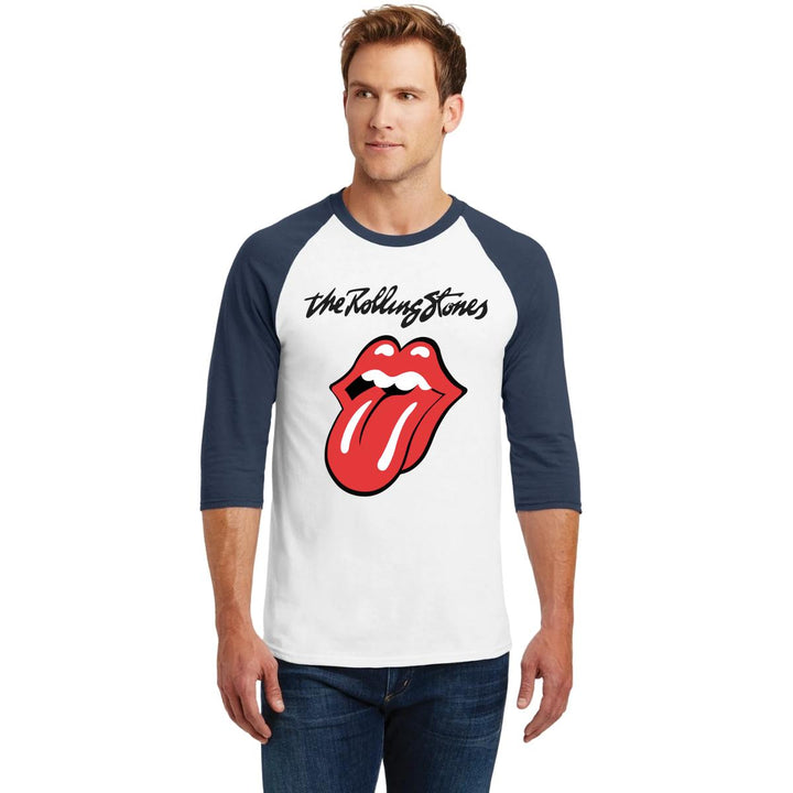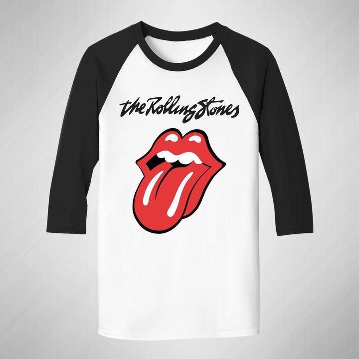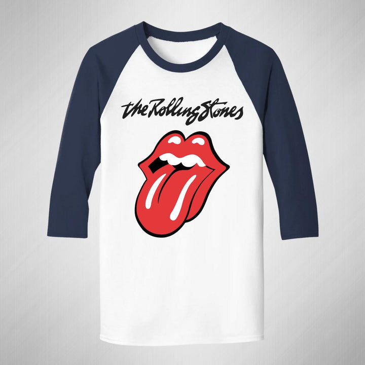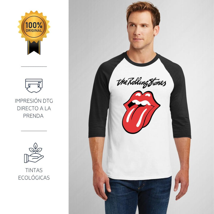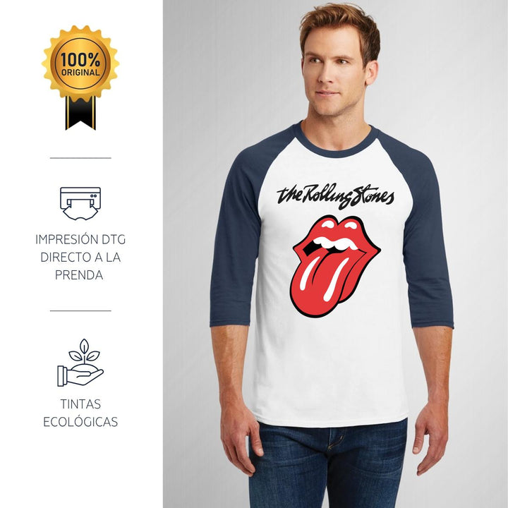 Playera de adulto raglán manga 3/4, cuello redondo para hombre nueva, diseño Rock The Rolling Stones original impreso con tecnología DTG (directo a la prenda) tacto cero, uso casual o deportiva, 100% algodón pre encogido, estructura tubular sin costuras laterales. Colores de camiseta para caballero: Blanco-Negro, Blanco-Marino.