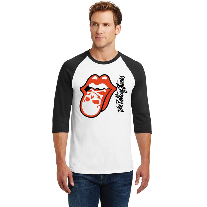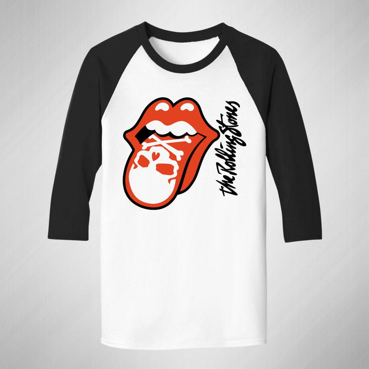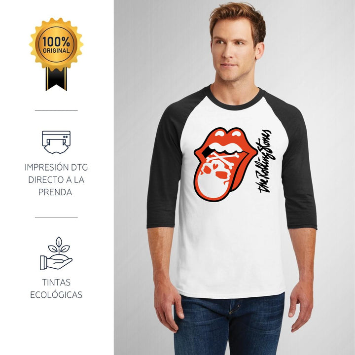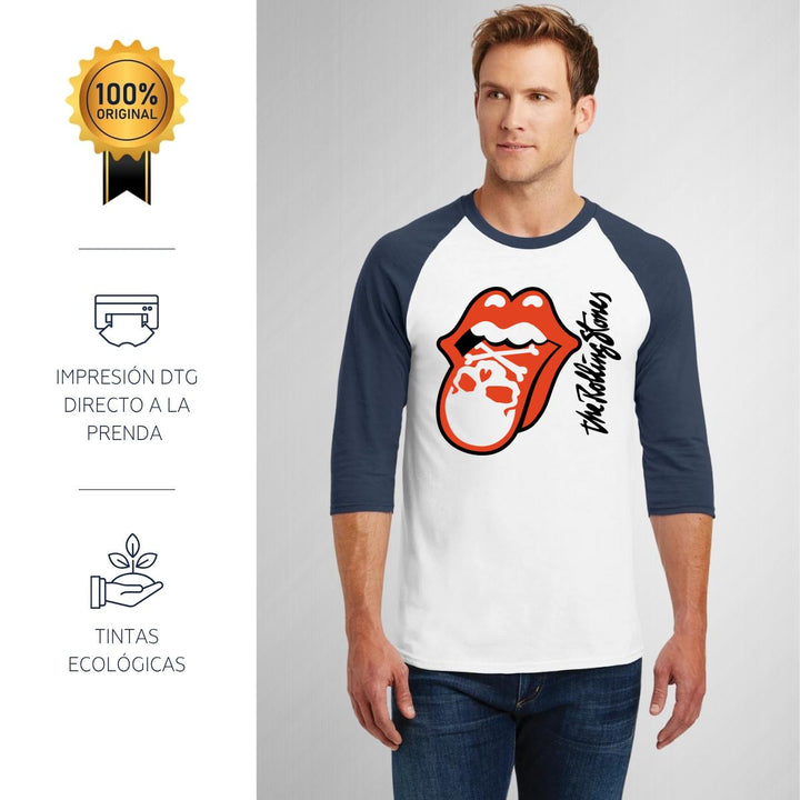 Playera de adulto raglán manga 3/4, cuello redondo para hombre nueva, diseño Rock The Rolling Stones original impreso con tecnología DTG (directo a la prenda) tacto cero, uso casual o deportiva, 100% algodón pre encogido, estructura tubular sin costuras laterales. Colores de camiseta para caballero: Blanco-Negro, Blanco-Marino.