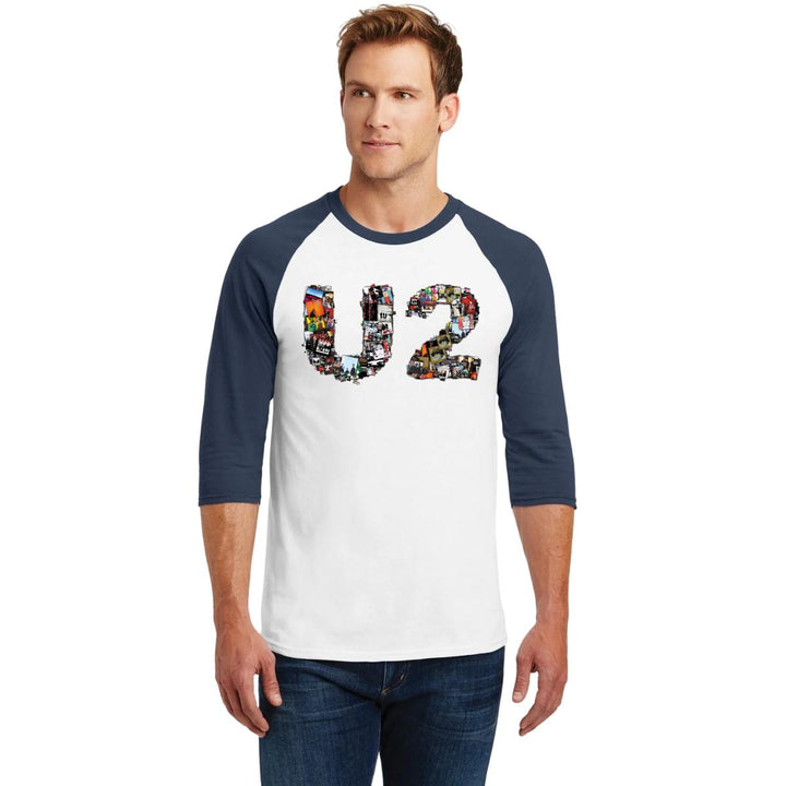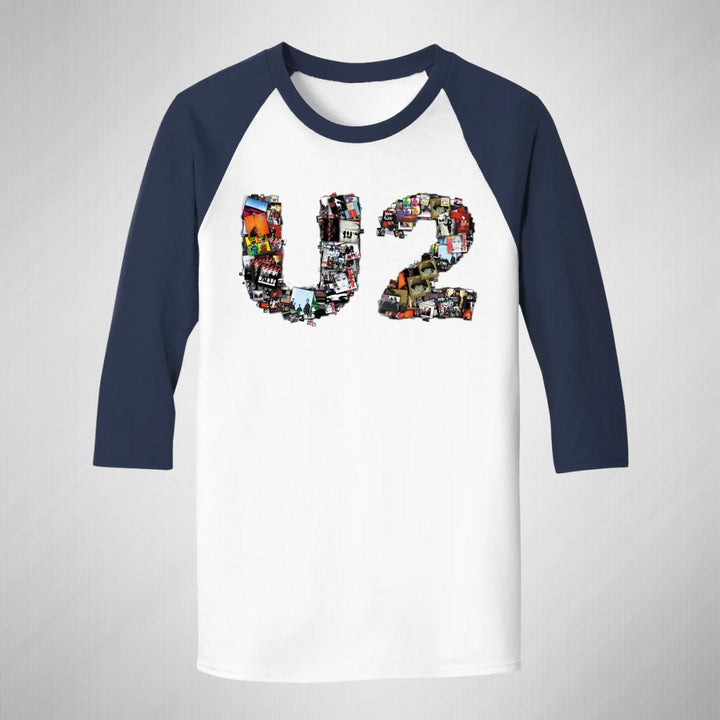 Playera de adulto raglán manga 3/4, cuello redondo para hombre nueva, diseño Rock U2 Portadas Discos original impreso con tecnología DTG (directo a la prenda) tacto cero, uso casual o deportiva, 100% algodón pre encogido, estructura tubular sin costuras laterales. Colores de camiseta para caballero: Blanco-Negro, Blanco-Marino.