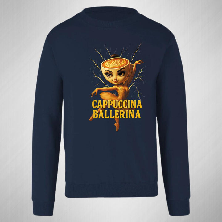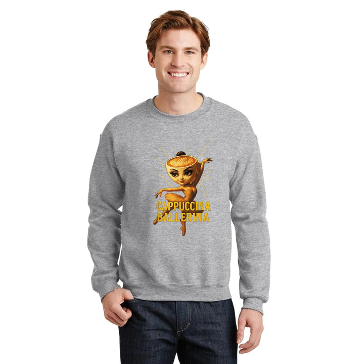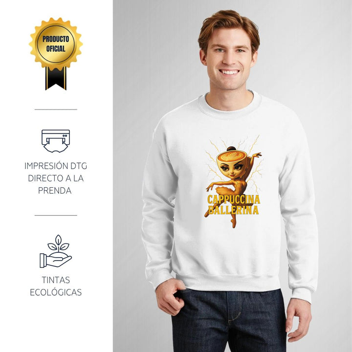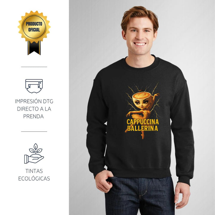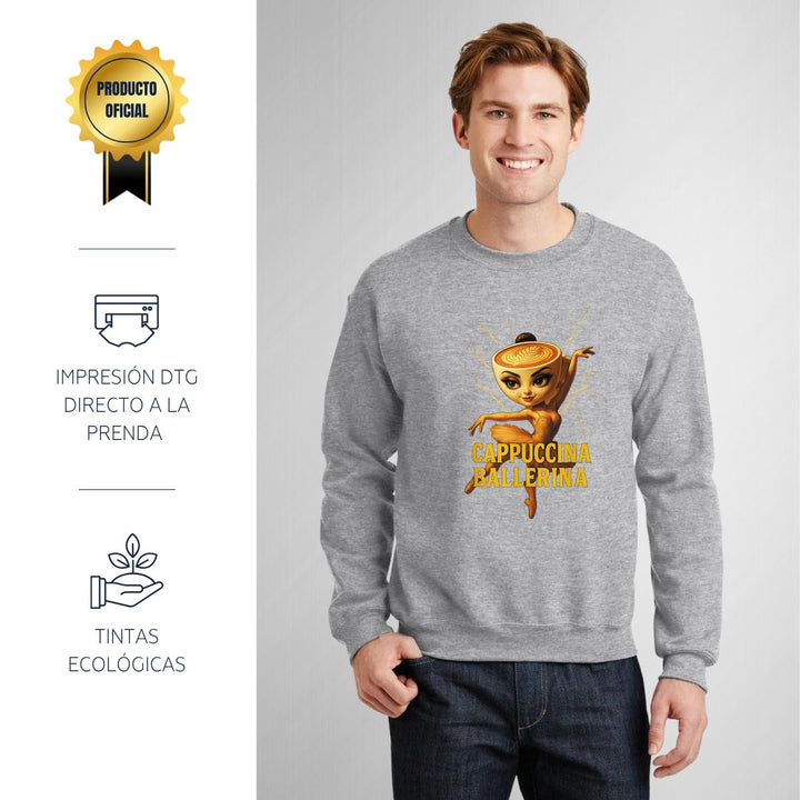 Sudadera de adulto cuello redondo sin gorro o capucha, para hombre nueva, diseño Brainrot Ballerina Capuchina original impreso con tecnología DTG (directo a la prenda) tacto cero, uso casual o deportiva, 50% algodón y 50% poliéster, estructura sin costura en los costados con ajuste clásico. Colores de sudadera: Negro, Blanco, Azul Marino, Gris.