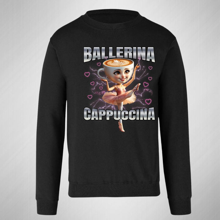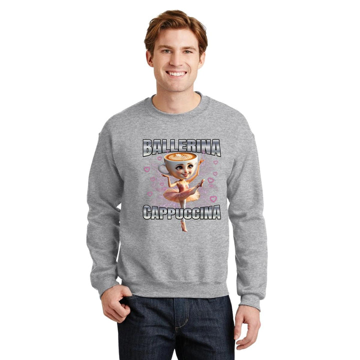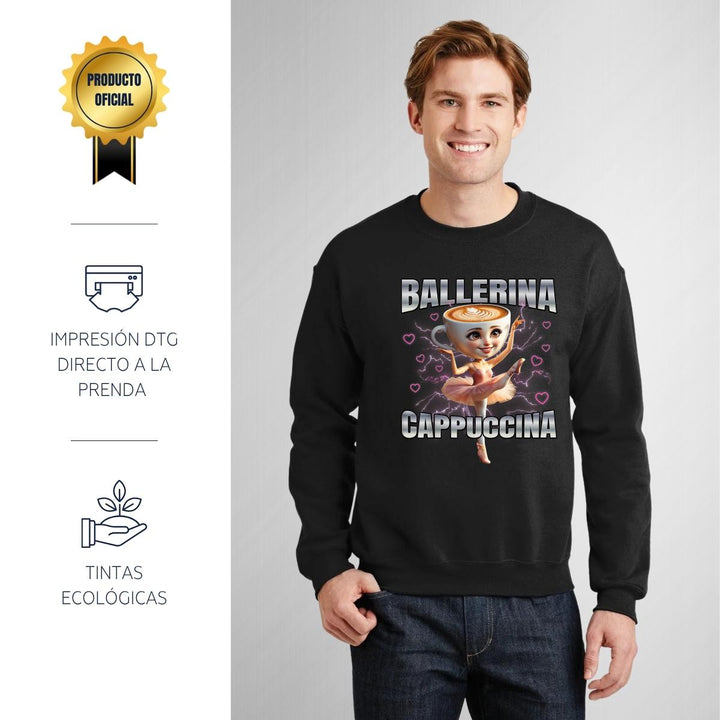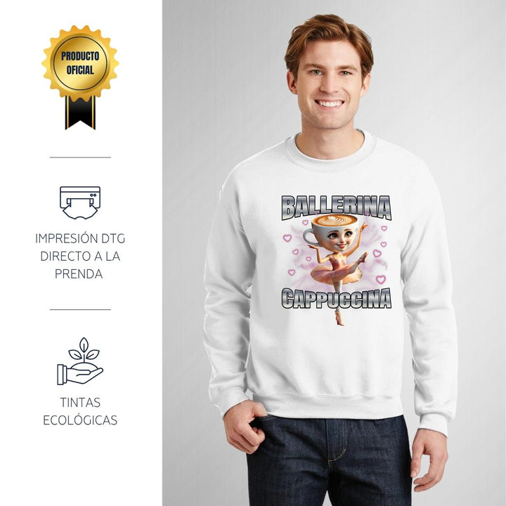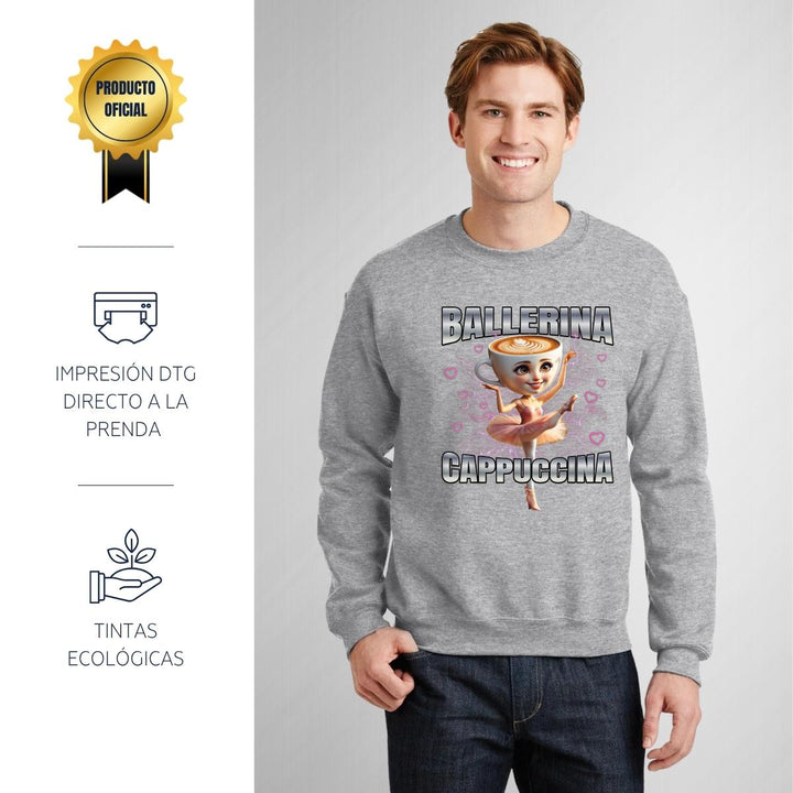 Sudadera de adulto cuello redondo sin gorro o capucha, para hombre nueva, diseño Brainrot Ballerina Capuchina original impreso con tecnología DTG (directo a la prenda) tacto cero, uso casual o deportiva, 50% algodón y 50% poliéster, estructura sin costura en los costados con ajuste clásico. Colores de sudadera: Negro, Blanco, Azul Marino, Gris.