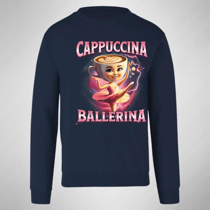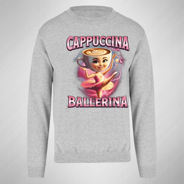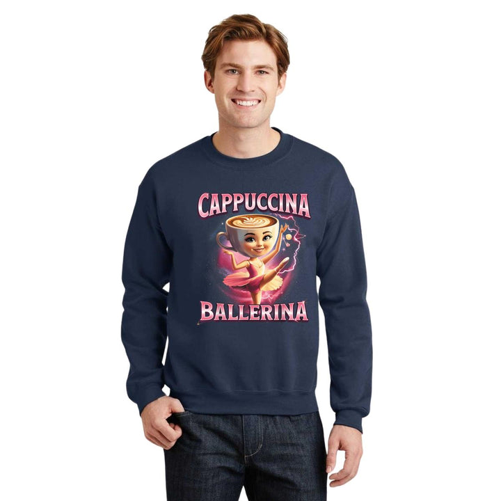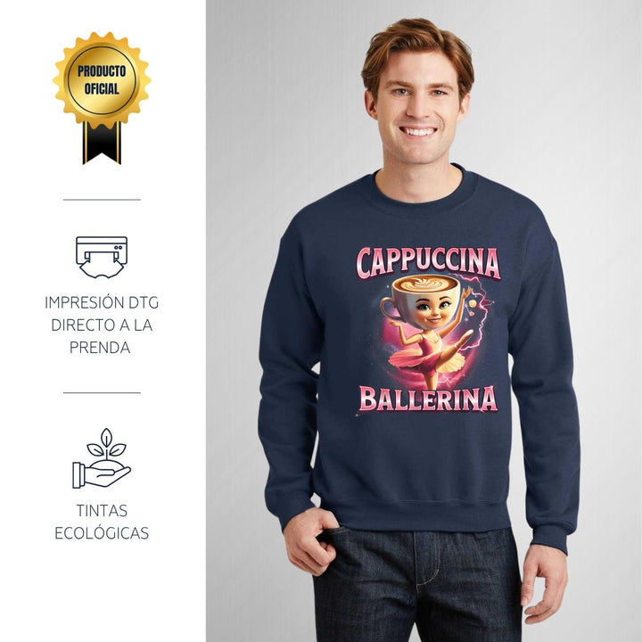 Sudadera de adulto cuello redondo sin gorro o capucha, para hombre nueva, diseño Brainrot Ballerina Capuchina original impreso con tecnología DTG (directo a la prenda) tacto cero, uso casual o deportiva, 50% algodón y 50% poliéster, estructura sin costura en los costados con ajuste clásico. Colores de sudadera: Negro, Blanco, Azul Marino, Gris.